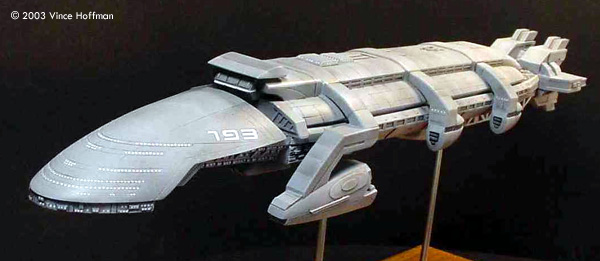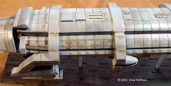 Step 4: Applying the wash An oil wash was prepared using artist oil paint 'burnt umber' and paint thinner. It is very important to use only paint thinner or mineral spirits, and nothing stronger (Testors airbrush thinner is too strong) and don't even consider using lacquer thinner, this will easily dissolve your acrylic paint. The wash was strained to remove any un-dissolved lumps of paint. A small pointed brush was used to apply the wash to all details, scribed lines and any other detailing that deserves a little shadow. The wash was left to dry for 2 to 3 days, or until completely dried. Step 5: Removing the wash After the oil wash was dry to the touch, I lightly dampened a lint-free rag with thinner and used it to remove the excess wash. Working in small areas, the rag was wiped perpendicular to scribe lines and details. To remove more wash, the rag was wiped parallel to the detailing. Paper towels should never be used to apply or remove a wash as the fibers in the paper will pull apart and stick to the model, and the roughness of the paper will scratch the painted surface. Step 6: Drybrushing After the model had several days to dry, it was ready for drybrushing. Once again, artist oil paint were used. White paint was mixed with a small amount of black to create a very light grey color, which was then applied using a large, soft round brush. Highlights were applied to most of the raised detail, as well as to lighten areas of the paint which turned out too dark. Oil paints make for excellent drybrushing because the drying time is greatly extended, allowing you to work the paint into very soft highlights on the model's surface. ![]() Step 7: Finishing After the drybrushed paint had several days to dry, the engines and windows were painted, and a black wash is added to the series of shuttle bay doors that run down each side of the ship. The windows were carefully painted using a fine line painting pen I found at my local art supply store. Flat white acrylic paint, thinned 1 part isopropyl alcohol to 4 parts paint, was used. Each window was then carefully 'dotted' onto the model. Engines were painted Testors Silver Chrome Trim and, after drying, painted acrylic clear blue. This gives the engines a reflective appearance. After the paint dried (once again) the entire model (except for the engines) was sprayed with a thin coat of clear matt acrylic and mounted on the permanent oak wood display stand. Conclusion Although this is an obscure subject, getting only a few seconds on the screen, I enjoyed building and painting this model and it looks very impressive in my display case. Construction was very simple, so I consider this an excellent model for novice resin kit builders and perfect for those advanced modelers who wish to hone their painting and weathering skills. |