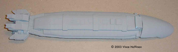 Painting Now came the fun part! Prior to painting, the model was mounted on a temporary stand consisting of a 2x4x12 and two wood dowels pressed into the model's existing mounting holes. Step 1: Priming the model After the model was assembled (without the truss in place) it was sprayed with Duplicolor automotove sandable primer and checked for any last minute touch-ups. A few seams were found and filled. Then the model was shot with a second coat of primer where the touch-ups occurred. Step 2: Painting the details The gray primer makes a very good, smooth base coat. On top of the primer, a series of acrylic dark gray panels were airbrushed using Post-It notes as masks. Panel highlights were applied along the scribed lines, and added in between the scribed lines to give a greater depth of detail. Once the various panels were painted, individual details are picked out and panted colors other than grey. The panel highlights and additional colors give the model a little more visual interest rather than being a homogenous grey space torpedo. Step 3: Sealing the paint Once again using my airbrush, a clear gloss acrylic was sprayed over the entire model. Every detail and surface was covered. This layer acts as a barrier between the paint below and the oil wash to come. A full 24 hours were given to allow the gloss acrylic to cure completely. At this point, the decals were applied and another coat of clear gloss sprayed onto them as a sealer. |