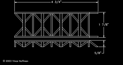Minor problems As with most resin kits, there are trials and tribulations. Fortunately with this kit, the problems are few and most casting flaws are well hidden. The most obvious problem is a latticework part that attaches to the bottom. This piece was cast using an open-face mold and warped badly, and the worse side of the piece would be clearly visible once in place. I replaced this piece with a scratch-built assembly - more on that later. On the front section, there are some scribed panel lines which appear to have run off the scribing guide. These can be repaired by a small amount of filler and re-scribing to the original panel line location. There are also numerous erratic scribe lines on the bottom of the model and on the 'pontoons'. Filling with putty and re-scribing can also fix these. This model, however, was built correcting none of the scribing flaws, but I just couldn't help myself when I saw just how badly cast the truss was.The Truss Scratch building the truss, which runs along the lower-rear portion of the model, is not difficult, although your ability to accurately cut many identical parts will determine your level of success. I started by test fitting the kit part, to see how well the part fit, and concluded that it was ¼" narrow and ½" short and didn't align well with the details around it. Taking the new dimensions into consideration, the latticework size and spacing was measured and individual parts were cut from strips of plastic. Patience is required while cutting and assembling, but the results were well worth the effort. |