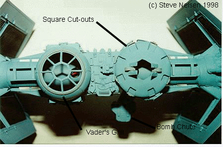 STEP 5 WING SUPPORT/BODY TUBES: Next, I cut the 1/2" tube to about 9" long. This became the center support tube running through the two body parts and engine box. Then I cut 2 sections of the 2" tube in equal 4" lengths. I drilled 1/2" inch holes through the 2 bodies leaving about 1/2" to the front of the body sections. When I finished drilling the holes in each I slid them on the support tube temporarily. I then marked the support tube for two 1/4'-diameter locating holes - one in the cockpit section the other in the bombing section. STEP 6 COCKPIT: This is made from one of the 4" tubes, a 2" hemisphere, and the 'grill' from the Vader's TIE fighter. I cut off the top of the hemisphere so the grill fit snugly on it. Then I took a scribing tool to the 4" tubes and scribed all body panel lines on both, sing my references as a placement guide. I placed the cylinders into a door jamb and used the edge as a guide to achieve straight lines lengthwise on the body tubes. I used a flexible plastic ruler as a guide to scribe lines around the circumference of the tubes. |