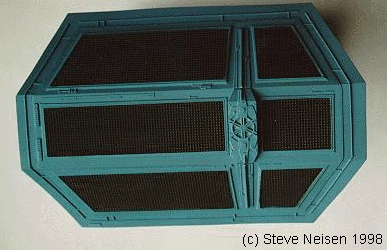 STEP 7 TORPEDO LAUNCHER/BOMBER BODY FRONT: Once again, I thoroughly studied my reference pictures. I cut out 8 equal squares from around the edge of the 2" flat dish. After this I cut a hexagon shape from the center of the dish (this is were the torpedoes are fired). After I finished cutting, I sanded the dish smooth and placed small sections of lined styrene behind the little squares I cut out - checking my references for placement. |