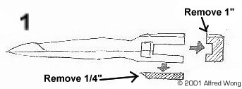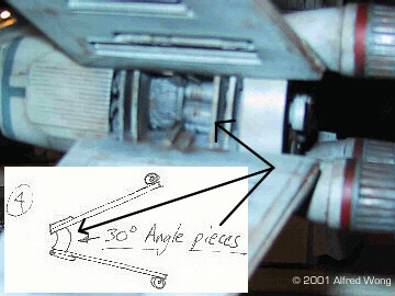 In deciding what the XJ should look like, I wanted to keep as much of the X-Wing as possible, while making it look more lean and up-to-date. It was also an opportunity to trim down that big back-end. The X-Wing studio models had that big, boxy rear end in order to house the S-Foil operating gear. I will outline 6 major steps for building the XJ. I used the large scale AMT/ERTL X-Wing kit, and used parts from 2 old Monogram F-16 kits and F-18 kits I have kept just for parts. Engine nozzles from a Starfury was also used. A small illustration is included for each of these steps. Step 1: Fuselage: Cut back the rear fuselage box by about 1 inch, and remove a good 1/4 inch from the bottom. Cover the bottom with a piece of .60 thou styrene, fill the edges and sand smooth. Add some panelling detail and landing gear doors to the new bottom. Blank off the back with styrene and add detailing. It's a good idea to modify the existing X-Wing details as much as possible for the sake of continuity. Step 2: Intakes: Assemble 2 sets of F-16 intakes (front & 2 sides). From the back edge, make a cut-out 1-3/16 inch long X 7/8 inch high for the wings, (you'll need to block out the remainder of the nose-wheel bay opening). Add a 3/8 inch strip of styrene to the back ends. You can use the detailed wheel-well bulkheads from the F-16 kits to box in the wing-insert opening. You will also need to make some kind of half-round detail piece for the inside, attach this to the bulkheads. Step 3: The S-foils: Remove the engine-mounting boxes from the 4 wing tops and replace them with flat, detailed styrene pieces cut to fit. These pieces should have an extended insert that will fit into the intake cut-outs. |