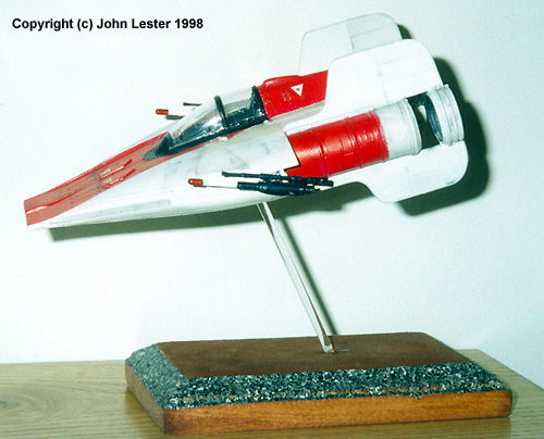 The A-Wing makes its one and only appearance in the ERTL's kit is (at time of writing) no longer available in the US. I got mine by trading a guy in Australia for something he couldn't get there. You can try that avenue - or check the UK's Star Wars Emporium or Q's Continuum for availability. When the package came, I could barely contain myself. My enthusiasm waned when I actually opened the box, however. It shouldn't have. Don't let the fact that this is a snap-fit kit fool you - unlike ERTL's TIE Interceptor, this kit actually fits together. Parts are crisply molded and with only 18 or so of them (including three clear parts) it goes together quickly. The raised panel lines are a bit overdone, but I was too lazy to do anything about them .... and that's my only complaint about the kit. Assembly is straightforward - and for once, one can even follow the instructions and not go wrong. I found it easier to snip off about half of each of the long attachment lugs so I could get a better fit without resorting to clamping parts in a vice. I glued everything, though the fit is so tight that it's not necessary in most areas. Imagine that. The only seam that needed fixing was along the sides of the fighter, where the top and bottom halves meet. I filled this with putty, sanded smooth, and then covered with a piece of 1lb test fishing line cut to length and super-glued in place. This replicates the raised panel lines found on the rest of the model. Lastly, I drilled out the concussion missile launcher "tubes" along the side of the ship and the barrels of the blaster cannon. I kept the engines off until the end, to make it easier to paint everything. I ditched the pilot and the landing skids - too ugly - and puttied over the holes where those pieces were supposed to fit. The real fun with this kit is in the painting. The cockpit is not bad - not tremendously detailed, but since there are no reference photos of the area (at least that I could find) I didn't worry overly much. I borrowed from my experience with aircraft models to dress the interior up. Sidewalls and "dashboard" received a coat of Testors Model Master (TMM) Aircraft Interior Black - a dirty dark, dark grey that looks more "scale" than flat black. The floor was painted flat black. Mixing subtly different colors like this gives a 3-D look to the area - try it, you'll see. The seat frame became Euro I Grey - again, a lighter shade of black - with dark grey seat cusions. The instrument panel was probably wrong - but without references, I can't say how. I left it as-is, and drybrushed the various instrument dials camoflague grey (which looks better than flat white for the same reasons as noted above with blacks). The "screen" was painted a flat light green, and various lights picked out with red, yellow, green and white. After everything was dry, I placed a drop of thined white glue over each instrument dial face - it makes a nice 3-D effect when it dries. For the canopy I used another old aircraft modeling trick. I dunked the whole piece in a cup filled with Future Acrylic Floor Polish. Then I pulled it out (using a pair of tweezers), wicked off the excess liquid that collected in an inside corner with a piece of paper towel, and set it under an overturned bowl to dry (the bowl keeps dust or cat hair from attaching itself to the wet floor polish). Another technique that works well is to polish the clear piece with an extrafine auto polish "swirl remover" (I use Meguiars), then wax with carnauba wax .... which produces stunning results, though I've not found the sci-fi kit yet that merits that much effort. With either technique, you end up with a crystal clear canopy. |