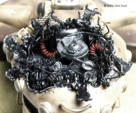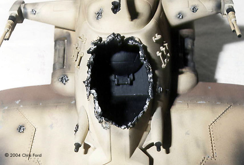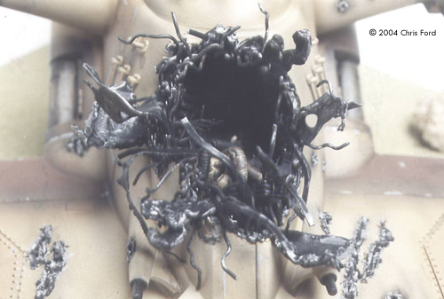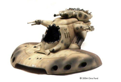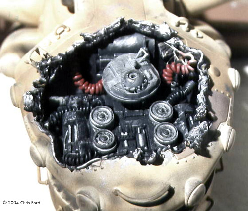 I followed the masking scheme as outlined in the kit instructions but once all dry, I wasn't happy with the appearance. I didn't like the look of where one colour stopped and a new colour started. Something was missing, but I didn't know what. So I decided to try and add some of the first colour over the "join" and onto where the second colour started. Now this is where the airbrush beats a paintbrush hands down. The effect was amazing - I really liked it. It softened the effect just right, so I did this to all where one colour met another. I then added a very pale "misting" of paint to help pull all the colours together. This was then followed by an even paler misting of flat black, as a weathering effect. Things were now starting to look quite professional. I kept wondering why I hadn't used an airbrush years ago. This whole paint process took about 2 weeks of working a few hours every night to complete. Explosive Detailing I detailed the cannon/turret first and again used my reference photos as a rough guide. I say "rough" because on the exhibition production model there is loads of room in which to scratch-build walls and an engine. But on the kit, after making the blast hole, you've got about a half inch in height and about 3 inches across in which to work...not easy. On close inspection of my tank, you can see the interior walls detailed and the engine block has been constructed. Materials for this were an old space toy cut into interesting pieces and many parts from a German Tank model kit. There were some superb interesting shaped pieces in that kit. The edges of the blast hole along with the rebuilt interior were all drybrushed with silver. Once this was finished, I attached it to the main body. Further detailing of mosquito mesh wire, 1mm sq. Plastruct sections, melted plastic Meccano and chicken wire was added later on. A section of the main cannon was also melted away, blackened and drybrushed silver, giving a further effect of ruin. At this point, having constructed and airbrush painted the remaining guns, handles and other minor model parts, I glued them to their locations on the main body. Now I could add the detailing to the frontal blast hole. This was done in a similar manner to the turret detailing. First, I had to build the interior. I had previously built a floor and a back wall just prior to attaching the body to the half-moon shaped base. Had I not done this, building the interior would have been difficult as it couldn't have been added later, and working through the hole was restrictive. Then I reworked the top turret hatch which I had removed earlier and glued it to the centre back wall, giving an appearance of an entry/exit point. All the interior was painted flat black. Then I rebuilt the walls with thin, black painted styrene which had some mosquito mesh wire (available at most hardware shops) attached to the inside and also painted black and its edges roughed up. Therefore, once attached to the interior model walls, it appears as if the model walls have some substance and structure and a multi-layer type of fabrication. Into this was inserted some twisted metal meccano pieces, also painted black and drybrushed silver, along with some chicken wire and more plastruct sections. For interior detailing and some of the "spillage" detailing I used things such as cut up space toy pieces, a mini bicycle, melted plastic meccano, part of my old car (now at the breakers), the brake cable from my 10 speed after it had been in a bonfire and 3 days in the rain, package strapping tape, some toy space weapons cut up and lastly I found a fridge magnet which had a STAP droid on it to the same scale as the tank. Cool!! I bought it, scrapped the magnet section and kept the droid. I repainted it better colours and then removed its legs and strewed them amongst the interior debris. I bent the arms inward at ridiculous angles and placed it in the centre of the gaping hole, and covered by a section of brake cable, giving the appearance that the droid is trapped. The effect is nice. I added extra blast holes and strafing burns again with the soldering iron, black paint and silver drybrush. The smoke effect was created with black pastel chalk. This was rubbed in by hand over key sections of the model top, sides and underneath sections. The final step was to spray a flat protective covering over the entire model. Parting Shots It took me about 2 full months to complete the model and is the first I have painted with an airbrush. I am very pleased with the result. It wasn't difficult to handle and I would encourage others to try it. The resulting difference is amazing. I have put it on a simple diorama and attached it to the base with a peg similar to that supplied with the kit base but slightly larger. The reason for this is, as the build up in the turret has added extra weight, the model wants to tilt backwards. This is where, if I were to do the same thing all over again, I would add some counter weight into the base at the first construction step. |
