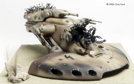 During my summer holidays, I was fortunate to take in the Star Wars exhibition in London at the Barbican Art Centre. There on display were props, photos, artwork, costumes and many of the objects for which Star Wars has become famous. Did I mention it also had models? Well it did...production models, and I had my camera. I shot a few rolls of film on the models themselves for future reference material, and it was in doing this I discovered their "tank". Wow, my jaw dropped. It looked nothing like the cover art of the model kit. For one, it was huge. Must have been about 10 ft long by about 5 ft wide. But what struck me was its depiction. It was constructed as if it had lost a serious skirmish. The front end was blown open, its interior spilling outwards. And the top of the cannon/turret had been blasted open like a tin of sardines, revealing among the debris, a powerful engine-like structure. I was truly amazed. I had never imagined to see it like this. (On screen, it is shown far in a background scene, and is hardly noticeable). I quickly loaded new film into the camera and got busy clicking. Well, I was so excited about this that as soon as I got back to my home, I went straight to the local model shop and purchased the last Federation Tank kit they had. Now I was inspired. First Impressions Arriving home, I immediately tore off the wrapping and inspected the contents. The main sections were quite large and in doing a test fit, it fit beautifully. I soon discovered this to be quite a robust kit, and thought it might make a good kit to start on for someone new to model making. I arranged all the pieces into groups to determine how best to go about constructing it. I decided on 3 main sections: the lower half-moon shaped base, the body and the cannon/turret. All other pieces were much smaller and could be added at a much later date. Tank Base I started with the base as it seemed quite straightforward in its construction. I did a test fit first - actually I test fitted all the major pieces prior to assembly and the slots and pins matched up perfectly. I wished all models were this snug fitting. So first I had to glue the exhaust pieces on the inside of the base as once the base was closed, there was no way of getting to the interior. In test fitting the parts, I noticed that in order to get a tight fit of the body into the curved slots of the base, a little pressure is needed. If the base were constructed as normal, the bottom glue seams could possibly split apart if too much pressure were used, so I widened these slots a little and also filled the base with closed-cell styrofoam. This gave the base a good degree of stability in handling it. (Had I known what was to eventually follow, I would have also added some counter balance weight as well, but I'll get to that later). A little Squadron white filler was used to fill the seam where the two pieces that made up the base were joined. Also a little filler had to repair some slight depressions caused by the moulding process of the kit, but this was quite minor. A fine sanding followed by an even finer wet sanding ensured a perfect smooth finish. Then I finished it off with a coat of white primer (Halford's automotive). The Main Body The body consists of two halves, a left side and a right. Gluing them together was quick and simple. I normally use a cyanoacrylite type glue but decided to try out the Humbrol liquid cement on this kit; I liked the idea of the nozzle supplied as part of the glue dispenser and found it worked a treat. This was left to set for 24 hours. During this time, I decided to look again at the sections and think the procedure through. I realised that in order to eventually paint the upper cannon/turret section, because of the way it snapped into the upper body section to retain it's turning ability, it would have to be constructed first. So I finished off the body by removing the frontal hatch (photos 3 & 4 - which I thought I might use later on but didn't) and the rear grille section, which I re-built. This was followed by a coat of white primer. Now I turned my attention to the turret. Upper Cannon/Turret The cannon consists of two halves as does the turret section. I glued the cannon halves together and let them set. I didn't want to chance any glue getting on to the turret fitting and prevent it (the cannon) from it's turning ability. Once set, I mounted it into the turret section and glued the turret halves together. Following another 24 hour setting period, I easily removed the upper hatch on the top of the turret using a mini hack saw. This piece I did use later on. The usual seam filling and sanding was applied as the pieces were set and again, followed by a coat of white primer. Blast Holes At an earlier period I had decided where I wanted the blast holes to appear and using a fine tip permanent marker, outlined the sections to be removed. I had performed a similar effect on an earlier model and so felt confident about doing it again. The pointed tip on my soldering iron, once heated up, it easily melted through the model plastic, leaving a kind of edge residue that was perfect for the effect I was after. I did this to both the body front and the upper turret. Once I was happy with the appearance of the body section, I glued it to the previously made base. Despite the neat fit, I was fastidious about filling the small but visible seam around the 2 joined sections. It took about 2 weeks of on/off puttying and sanding sessions before I was happy. Once complete, I primed the seams. Now it was ready to paint. Airbrushing Just before the start of my summer holidays, I managed to purchase a second hand air compressor with an old, clogged-up Badger air-brush thrown in. I took the "brush" apart and spent about 3 days cleaning it. Having never held an air- brush before, let alone use one, I had no idea what to expect. Following my exhibition reference photos for a colour match, I came up with a paint scheme which was diff
