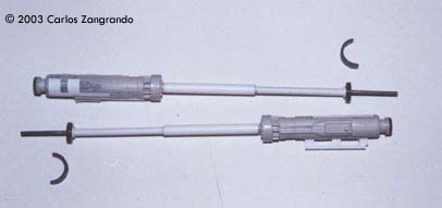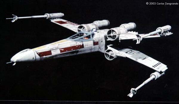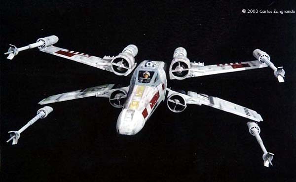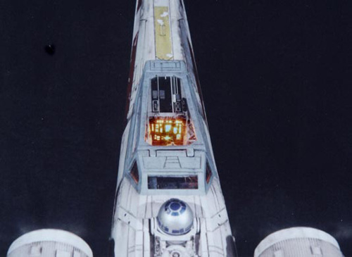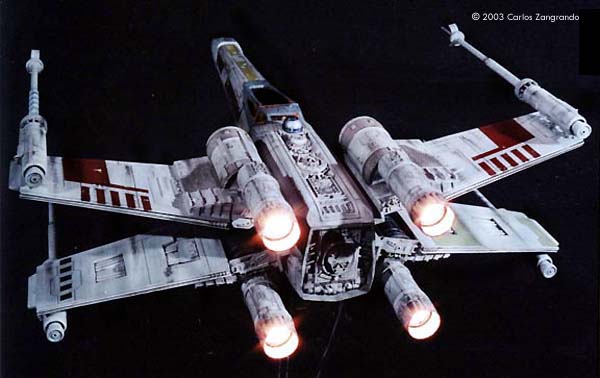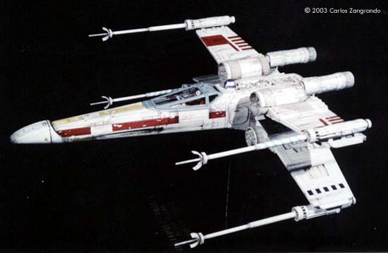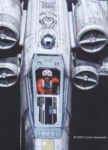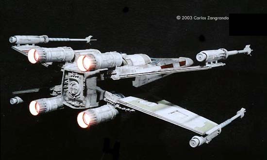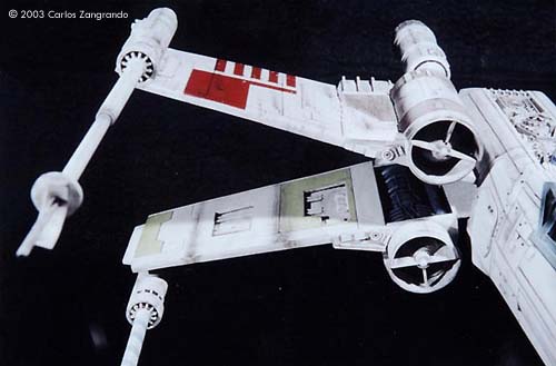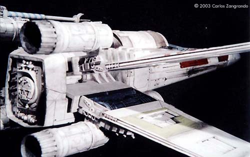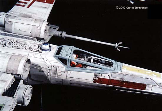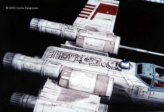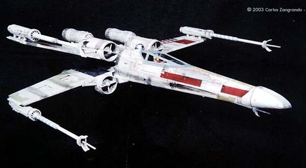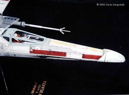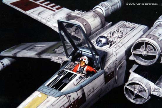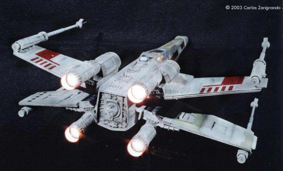 One of the most interesting aspects of the STAR WARS movies is the starship designs. Most came from the magic pen of master Ralph MacQuarrie. The Incom Corporation T-65 Fighter, or X- Wing fighter, has become one of my favorites. Just after the releasing of the movie, MPC got the rights and released a model of the X-Wing, in 1/48 scale. It's a fairly good model, and up to the best model standards of the time. In the 90's, ERTL announced the release of a "special edition" X-Wing model, in their ProShop line. With much anticipation, I ordered mine as soon as it was released and ... what a disappointment. Yes, the model has interesting features, such as a voice chip with original lines of the movie, and two motors and gears for the wings and cockpit canopy. But the detail is POOR... I mean, REALLY POOR. Even the shape of the fuselage is wrong! It seems to me that, in order to cut the costs, they hired a poorly skilled craftsman to make the patterns for the molds, or simply didn't care too much about it. Even the old MPC 1/48 version, despite all faults, is much better detailed. Well.... Since I spent a lot of money on the thing, I really had to do something with it. So I decided to scratch as much as I can, in order to get a better and large version of one of my favourite spacecrafts of all time. I decided to do the famous RED 5, to represent the famous Death Star trench sequence. Assembly and Modifications First, I re-scribed the entire fuselage, glued some plastic ships for the box cover details, and cut away the detail section behind R2-D2 station. I cut the nose cone detail from the upper fuselage piece, and glued to the bottom fuselage. Then the fuselage bottom was re-scribed, and some bits of styrene sheet glued. I filled and sanded the diamond shaped support hole and also extended the back of the fuselage a little. Here you see the main connector (female) which will connect the model to the base, so the model can be removed for play... errr... "transportation". That strange "six wires" coming out of the starboard are secondary power connections, which will become hidden beneath the "wing" (never trust only one power connection! ).Here you see the interior of the bottom fuselage, with all wires running through it. I've reworked the nose cone, and rebuilt the "sensor window" and the photon torpedo launcher. I then reworked the bottom of the wings, sanding all the wrong detail, and reshaping the wing openings to a more correct profile. The back of the wings were also rebuilt, according the details from the actual filming miniatures. The trench was made using an U shaped styrene strip. The upper side of the wings were severely reworked next. I sanded away most of the detail, re-scribed and made new detail from sheet styrene. The laser cannons were rebuilt, using styrene tubes, and new detail cut from styrene sheets. The alignment was assured using a steel rod running all through the center of the tubes and model kit part. Next I made a new detail part for the deflector shield and hyperdrive generators, behind R2's position. It was made with styrene sheet and lots of bits from my spare box. The back detail was also reworked. I also made a new cockpit canopy from sheet styrene. Only the back of the original piece was used. Surprisingly, the cockpit is fairly good. I rebuilt the computer (?) behind the seat. Note that a trench was left in order to allow the canopy opening mechanism. I also reworked the seta (?) and the headrest. The pilot figure is very good, but represents a well known photo of Luke when he crashes at Dagobah, in "The Empire Strikes Back". The uniform is the same, but if you want to build a Star Wars version, you must paint the gloves black. I then made a black box from styrene, with a clear plastic end. It became become the main cockpit display, with lighted instruments. The main engines parts are ridiculously wrong! I had to build new ones from scratch. The only kit parts I've used are the engine nozzles, which were drilled out and thinned from inside. The engines were painted black to avoid light leaks. New engine "intakes" were built as well using sheet styrene. New engine details, which will be used at the inner part of the wings, were built from styrene sheet, strips and half-rounds strips. The four cooling sleeves at the sides were cut from a cheap plastic pencil sharpener I found at the supermarket. Here you can also see my R2-D2 unit. I cut the dome from the kit supplied part, sanded all detail and glued it to a styrene tube. R2's arms were attached later. My last modification was the male connector, which will be permanently fixed at the base support. It's a six pin computer monitor gold connector. Paint and Decals I painted the model using acrylic paints, and carefully weathered it to approach the Star Wars "look". I printed my own decals, using my old and reliable Citizen 600C dry-printer. The decals were scanned from the Finemolds decal sheet, and resized to properly fit the ERTL model. It's a 100% improvement over the horrible original ERTL decals! I still have all scans. Anyone interested, please feel free to PM me (Arthur Pendragon on the Discussion Forum), and I'll send a copy. Display I've used the original base, but made a new support, which doubles as a electrical connector. I really believe that the base must be simple and elegant, in order to do not drive away attention from the model. Electronics and Wiring Surprisingly, all the electronic gizmos work pretty well. The base-mounted chip has some cool features, including Vader's voice ("I have you now! " and "Don't make me destroy you"- which is a line from TESB, not SW), Luke's voice ("Red Five Standing by..." and "I'm Luke Skywalker"), and some other sounds. The lights and motors also worked OK. Electronic novices may need some help to install the electronics, but I found the task fairly straightforward. Final Words It took me four months to finish this model... the result was worth all the time and 