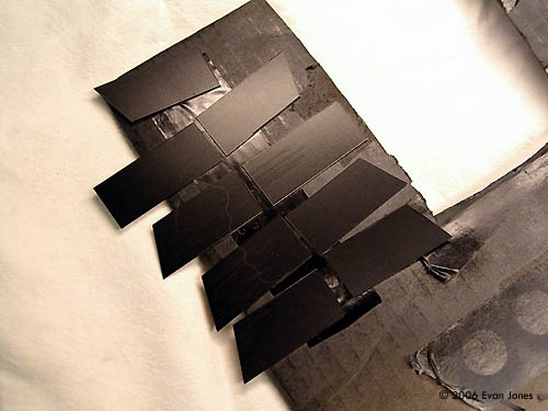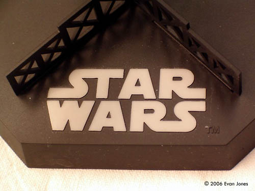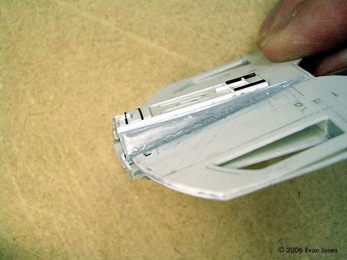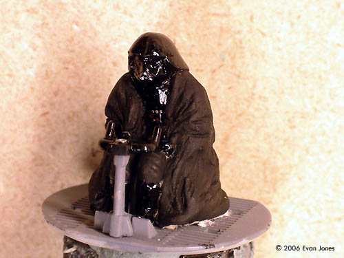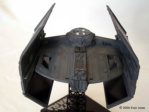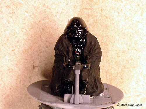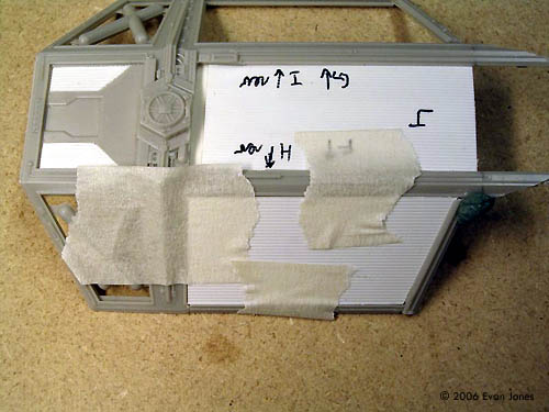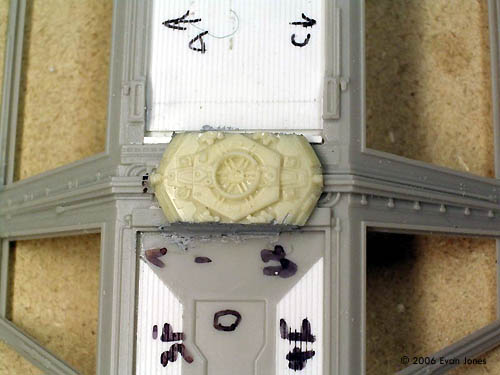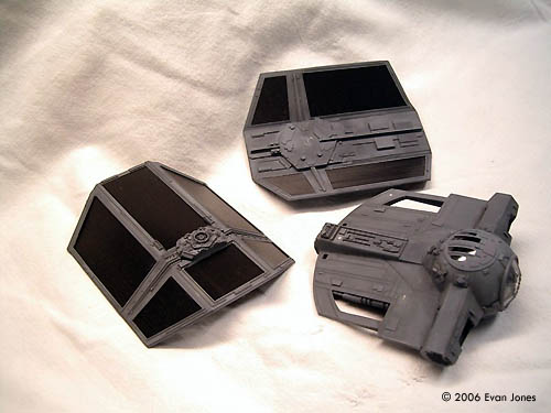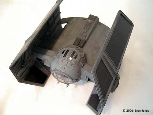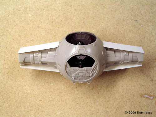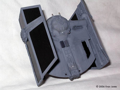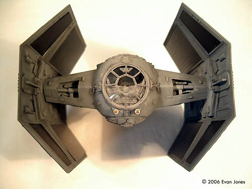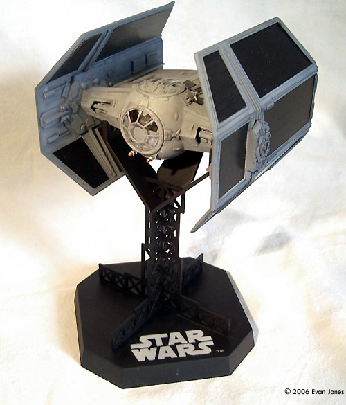 The longer, rear section of the body was built using sheet 0.5 mm (0.020) sheet styrene and the MPC kit as a guide. Two copies were laid out for the bottom and the top, with the four holes and panels drawn on the sheet styrene. Since the rear section was not the same thickness across the width or length, an inner bulkhead was cut out of 3.2 mm (0.125) sheet styrene. After scribing the panel lines, the upper and lower sheets were glued to the bulkhead in the interior and to each other on the outer edge. The front part of the section was shaped to fit the back of the pod and the new, thicker arms. The thicker center section was built using 0.5 mm (0.020) sheet styrene for the sides and top. Another piece of 0.8 mm (0.030) sheet styrene had the slots cut in them using a #66 drill for the ends and a sharp #11 blade and straight edge for the joining the holes together. Small pieces of styrene strip, rod and sheet were added for the various mechanical details on the body to match the MPC model. The MPC kit shows that there are four ion engines on the back of the cockpit, compared to two on the TIE Fighter/Interceptor. I made a mold of one of the engines and cast some extra pieces for these details. Dark Pilot Although difficult to see inside the cockpit, I decided to have some fun and convert the pilot figure to look like Darth Vader. It started by slicing the figure in half horizontally just above the arms. This location meant that I did not have to worry about changing the height of the controls. A section of 2 mm (0.080) square styrene rod was glued between the two parts. This gave the figure the correct height for Darth Vader. The bumps on the helmet and the hoses on the face mask were cut off using a hobby knife. The figure was glued to the seat, excluding parts A2 (seat back) or A11 (arms) as this would be covered by the new figure. Using the MPC figure for guidance, I then mixed up a two part epoxy used for fixing holes in wood. It is made by Polymeric Systems (www.polymericsystems.com) and can be found at various hardware stores (I got mine from Lee Valley Tools in Canada). This product is easy to work with, can be worked for about 20 minutes and can be sanded, drilled and painted after it sets. This epoxy was draped around the body and some folds and wrinkles sculpted using a little spatula. The helmet was done the same way. Once dried, the helmet was sanded smooth. A tiny triangular piece of .25 mm (0.010) styrene sheet was cut out and glued to the face to serve as the Darth Vader mask. The helmet, gloves, chest and boots were brush painted with Tamiya X-1 Gloss Black, while the rest of the body and cape were Tamiya XF-1 Flat Black. Silver and red paint was applied with a sharpened toothpick to the triangular face mask and the chest piece to simulate some of the buttons and details of Darth Vaders suit. The TIE Interceptor stand would not hold the new model because of the rear extension. The arms of the stand were modified to match the profile of the new arms. A third arm (from a TIE Fighter kit) was modified and glued in place to hold the rear section. Painting The solar panels were painted Tamiya semi-gloss black directly from the can, which gives a finish with much more gloss than using the thinned bottle paint through an airbrush. The rest of the model was Tamiya XF-66 light gray using my airbrush. Some smaller details were brush painted. An excellent masking kit from Starship Modeller was used to mask off the cockpit front canopy window and the top of the cockpit. Finishing Touches Left over decals from both the TIE Fighter and TIE Interceptor were placed on different spots on the model. The technique used was the following: