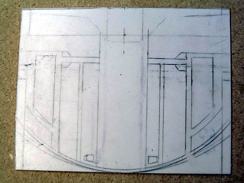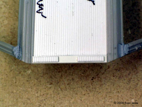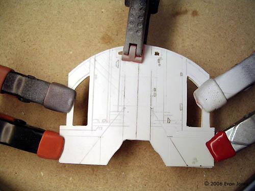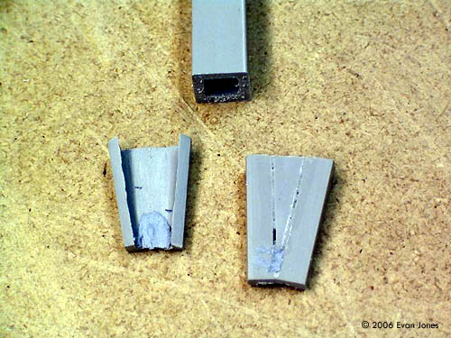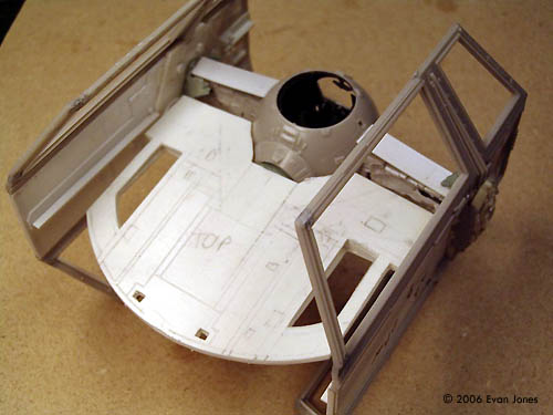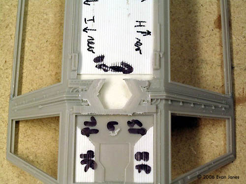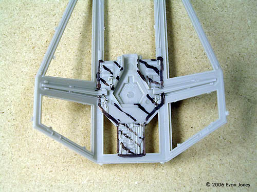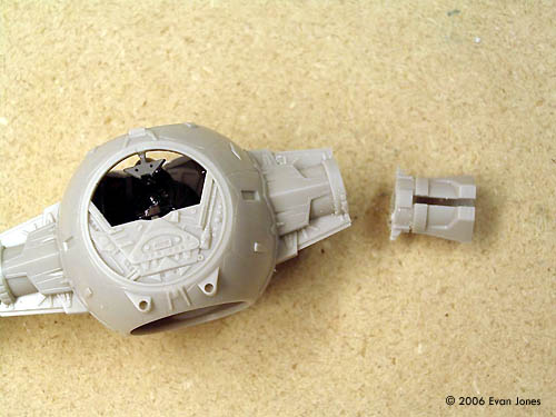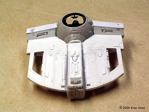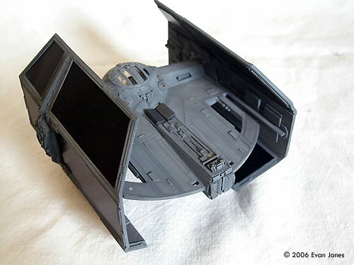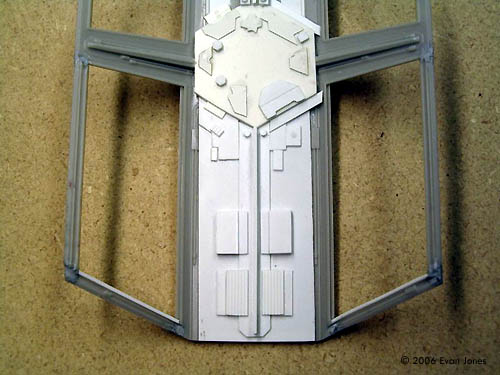 By turning the wings of the TIE Interceptor backwards, the front portion of the wings was pretty well done. The pattern of the solar panels is different than the TIE Fighter and is a raised, rectangular pattern. I thought that I would initially make castings of the existing solar panel inserts and splice them together to make the larger panels of the X1. However, this looked to be very time consuming and difficult to replicate accurately. In the end, I replaced all the solar panels with Evergreen V-Groove sheet styrene (number 2025, 0.64 mm (0.025) spacing 0.5 mm (0.020)). This gave some texture to the panel, although not perfectly accurate. The kit panels were used as templates for making V-Groove replacements. Care was needed because not all the panels were exactly the same some edges needed to be beveled to fit correctly into the frame. The longer top and bottom frames of the Interceptor wings were cut off. These were then cut and filed to make the longer back portion of the wing. There was just enough of the frame to complete the top and bottom of the wing. Styrene strips were used to build a frame for the center part of the wing. Using the MPC kit as a reference, various styrene sheets, strips and rods were used to add the detail to the inner part of the wings. The outer part of the X1 wings have a circular shape that is not quite the same as on the TIE Interceptor. A mold was made of the shape from the TIE Fighter and two pieces were cast from resin. These pieces were then cut to shape and added to the wing, with some putty used at the joints. The Pod Arms The arms connecting the pod to the wings are bulkier than the TIE Fighter/Interceptor kits. The arms were also at a different orientation with respect to the cockpit - flat on top and bottom, whereas the TIE Fighter/Interceptor arms were pointed. In addition, there were some mechanical details sunk into the arms that needed to be replicated. The conversion started by assembling the TIE Interceptor cockpit. This meant that the interior had to be built up first (see below under Darth Vader figure). The arms were cut off with a razor saw, turned 30° and glued back on. Sheet styrene strip 0.5 mm x 6.4 mm (0.020 x 0.25) was first added to the upper and lower arms. Sheet styrene 0.5 mm (0.020) thick was used to make the other sections of the arms. Openings were made for the inset details for both the front and back of the arms. Styrene shapes at 90° were cut and placed behind the rear openings. These were glued on and detailed with styrene rods of various thicknesses. The larger front openings were made from cutting square styrene tube, splicing in a triangular piece and adding to the arms. In order to minimize the use of putty, all the pieces were cut precisely and bevelled on certain edges to make the joints and gap free as possible. Panel lines were scribed to match the lines on the larger MPC kit, although they were simplified somewhat. I learned the hard way that the panels should be scribed before being glued on. The Body The X1 has an elongated body section on the back. There are two distinct sections to this