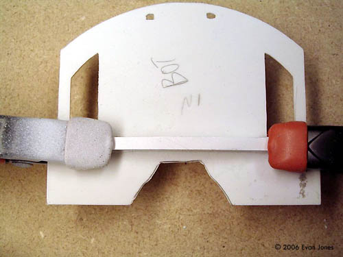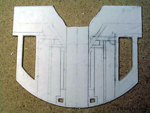 ^ Front view Step by Step Photos: ^ Completed Vader figureImage: Pilot before conversion. Image: Side view Image: Darth Vader before painting Image: Note the white styrene insert and the Quikwood material built up for his helmet and cape. Image: Painted ^ Setting up TIE Fighter wing and ion engine for casting. Image: Another look Image: Parts being cast. Image: Results ^ Area of inner wing that was filed smooth. Image: Another look Image: After filing smooth, holes were filled with sheet styrene Image: Then shaded area was removed Image: Details of inner wings were built up with sheet and strip styrene. Image: Another look Image: One section of frame was removed and a solar panel cut to desired shape and size Image: Then the frame was cut to match the panel. Image: Panels were taped place while superglue sets on frame pieces. Image: Each panel was labelled so that it can be fitted to the correct location later on. Image: Outer details were filed off and then resin cast piece glued on. Image: Another look Image: The outer rear part of wing were detailed with sheet styrene and some small pieces of the solar panel V-groove sheet. Image: The inside of the wings could probably use more finer detailing. Image: Solar panels were mounted to double sided tape on cardboard. Image: Pieces were painted with Tamiya Semi-Gloss black straight from the can. This gives a shinier finish than using thinned bottle paint. ^ Arms were cut as shown .... Image: ... then rotated 30° and glued back on. Image: Strip styrene 0.5 mm (0.020") was added to top and bottom of arms. Image: Notches were cut in bottom pieces and edges were bevelled for a tight fit. Image: Back of arms were cut from 0.5 mm (0.020") sheet styrene, with indent made from square tube, cut lengthwise. Image: Edges of styrene beveled to make joints tighter and use less putty. Image: Rear Inserts were detailed with styrene rod, 1.0 mm (0.040") and 0.5 mm (0.025") diameter. Image: Front arms were made of 0.5mm (0.020") sheet styrene. They were taped temporarily in place and the front joint only was glued. Image: When dry, it was removed and the opening for indent was cut out. Image: Front of arms with openings cut out and markings for scribing panels. Image: The indent was made from square styrene tube, cut in half at an angle, split open and widened and then the edges bevelled to fit inside arms. Image: In order to make the front arms fit, a lot of the existing arm was removed using a Dremel tool. Image: The indent was detailed with styrene rods and sheet, wire and a small pieces cut from parts G4 and G5. Image: More detail ^ Body panels were laid out on 0.5 mm (0.020") sheet styrene, showing where panels will be scribed and where raised panels will be located. Image: An internal brace for the body was cut from 3.2 mm (0.125) thick sheet styrene. Image: This picture shows what it looks like once glued in place. Image: More layout Image: The brace was glued and clamped onto one body panel and left to dry overnight. Note that brace forms front end of the larger hole. Image: The other half was glued, clamped and left to dry overnight. Image: Central spine of body was made up of sheet styrene, cut to shape and glued in place. Image: Bottom detail were made of: sheet styrene with drafting tape straps, sheet styrene with slots cut in, sheet styrene, styrene rod. Image: Slots were laid out using #66 drill to start. Image: Slots Image: Top of body was detailed with sheet styrene, styrene rod, wire, styrene half round, sheet styrene with slots cut in and some details cut from part G2. Image: The end was detailed with pieces cut from parts G2, G4 and G5. Image: The detail part for the larger opening was made from styrene rod and tube. Small raised panels on the body and arms were made from 0.25 mm (0.010) and 0.50 mm (0.020) thick styrene. Image: The rear just before painting. Tamiya putty was used on the joints. ^ An early mockup of the model was done to check the fit of the parts. Image: Looking good ^ After painting, the wings were glued onto the body one at a time using 5 minute epoxy. Image: The stand modified to hold model the original arms were changed at the top to a different profile and a third arm from TIE Fighter kit was cut down and added to the rear to hold up the back of the model. Image: Another look Image: After airbrushing stand with thinned Tamiya Semi-Gloss Black (taken from bottle), the area around the lettering was masked. The paint was sanded off the lettering and then finer sanding pads (from 3200 to 12000 grit) were used to highlight the Star Wars logo and give it a shinier finish. |