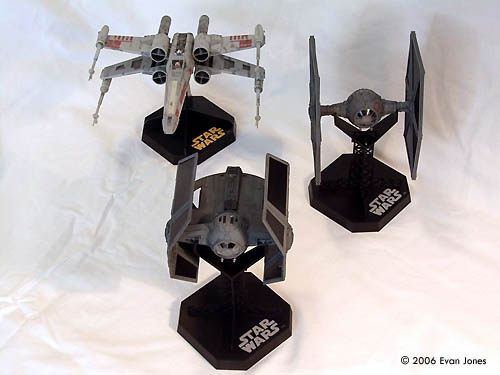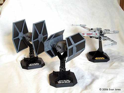 A light enamel black wash was added to the entire model to bring out the detail. The guns on the front were brush painted silver, then Tamiya clear orange on the front part. A little spot of Tamiya X-7 Red was put into the exhaust ports of the ion engines. The stand was painted Tamiya semi-gloss black from the bottle, thinned and shot through an airbrush. This gives a really nice finish that is shinier than flat black but not quite semi-gloss. Completed Model: ^ Rear viewImage: Underneath Image: Another look Image: Front view, low Image: Above/front Image: front/right ^ From above Image: Front view Image: Rear view Image: All three ANH fighters Image: Again |