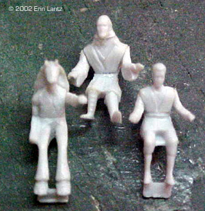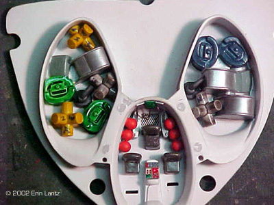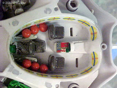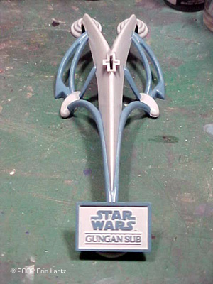 Assembly Assembly began with taking the parts and dry fitting all of them to check the fit of the parts. ERTL kits can be stubborn in this area, so doing this step really helped when gluing later, I knew where all the trouble spots were going to be. After the dry fit, I cleaned out the major snap fit alignment holes so that the parts would slide instead of locking, mainly to make the parts come together better. Flash clean up was annoying, this kit had little flecks sticking out all over the place! All edges were trued with an Xacto and mold lines removed. Next I coated the cockpit "glass" with several thick layers of MicroMask. This stuff is great for masking, but make sure you put it on thick. Previous experience has showed me that if you only put on one or two coats, you will never get it off without scratching the part underneath. I applied 5 layers, holding the part and rotating it slowly while drying with a hairdryer on low heat. Rotating the part allows the masking to dry evenly across the part, and the hairdryer dries the surface of the wet masking so that it stays where you put it. It takes some patience, but it really isn't hard to get it on thick and evenly, and that is vital to it working in the way I useed it on this kit. Next up to assemble was the cockpit tub. The walls of the tub are molded in one piece that just drops into slots in the floor. Fit is good, but it will have to be clamped tightly until dry or gaps will show in some areas. During assembly I decided that Qui Gon Jinn's seat was too far back, so it was cut out and moved forward. Some details on the back and side walls were missing, so I dug out the scrap box. What I assume to be air tanks were made by gluing bb's to the walls on each side. The hole in the floor left by QuiGon's seat was filled with a photoetched metal drain, and various helicopter parts were utilized to detail the back wall and the center console to roughly approximate the detail seen in the Cutaway book. Various other parts from the spares box were also test fitted in the side compartments at this time. Parts from the Anakin's Pod kit are in there as tubing, some resin curly shavings as seaweed, whiskers from the DSV kit, and a 1/35th Iraqi backpack, as well as the kit supplied cargo. Once all was dry, the whole cockpit was painted with Krylon White Primer and once dry was clear gloss coated. Decals for the displays were then added. The first disc in the decal design had to be cut so that it could be positioned separately from the others. It just didn't look right the way it was supposed to go down, the curve was too big for the decal to make it around. The figures as included in the kit looked WAY too stiff for me. I cut their arms off and repositioned them to more natural-looking poses, and in Qui Gon Jinn's case his legs were cut and repositioned so that he was leaning forward against the front seats. All the gaps were sealed up with CA and the figures were painted more or less to kit suggested colors. The flotsam was all painted at this time as well. Once dry it was all glued in permanently. The final step towards cockpit completion came in the addition of the cargo bay netting. My wife supplied the necessary bath netting for this. I cut two ovals slightly bigger than the bays from the netting, sprayed it all black, then carefully glued it to the outside edges of the cockpit bays with CA, stretching it as I went. Now that the cockpit was finished, hull work began. The canopy glass was glued with Ambroid to the upper hull with care not to rip or mess up the Micro Mask applied earlier. This part was clamped tightly to dry overnight to ensure that it was dried hard . Next the cockpit was glued hard into the lower hull and clamped tightly as well. This kit needs lots of clamps and clothespins, so get them ready if you build one! The little light scoops in the outside edges of the hull were also glued in and left to dry before proceeding. This eased the hull assembly; they kept popping out during dry fit! |