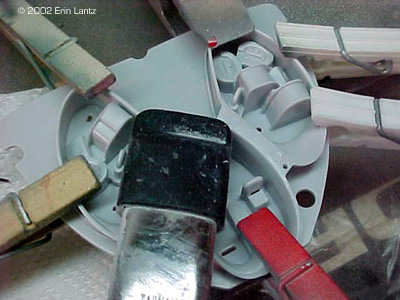 Once top and bottom halves were dried hard, they were joined and glued with Ambroid. Clamping must be done carefully so as to not crush the hull, so use weak clamps here. This is part of the reason I cleaned out the holes earlier; it made final assembly easier. It's bad enough that the cockpit tub holds the hull halves apart slightly! Careful clamping left gaps though. Once dry, the seams were addressed with Bondo Spot Putty, and then the whole kit was lightly sanded with fine steel wool.