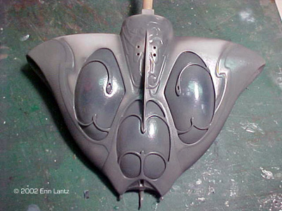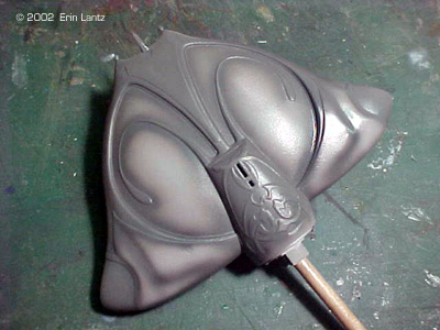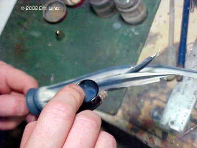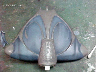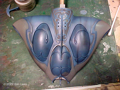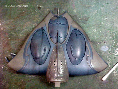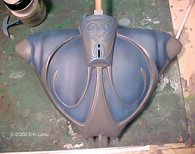 Painting the Tail Image: The base coat for the fins Image: Fins with grey coat Image: Spraying the darker blue Image: Adding the Lighter blue Image: Tail mostly painted Image: Masking the raised detail Image: Wiping detail with mineral spirits Painting the Hull Image: The first grey Image: Top view Image: Adding the shadows Image: Finished with the grey Image: Blue sprayed and streaks added (bottom) ... Image: ... and top Image: Finished hull (bottom) ... Image: ... and top |