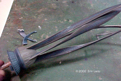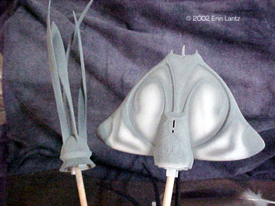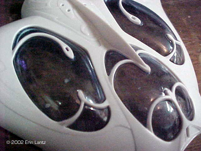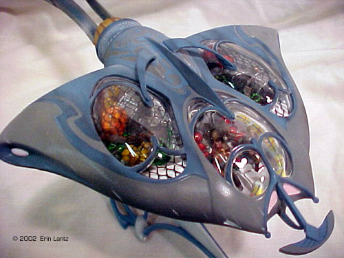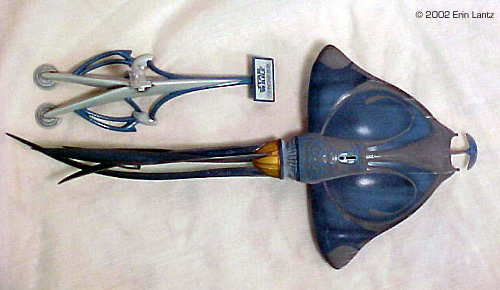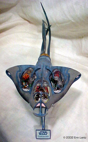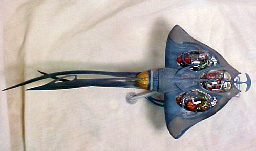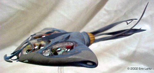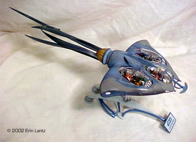 The tail fins were left masked after the application of the blue. Using a napkin dampened with mineral spirits, I removed the blue from the raised detail on the fins to leave the earlier applied grey that was sealed with acrylic clear. Once done, it was again sealed with acrylic clear. After allowing the clear to dry on the hull and tail for about a week, I next masked the lights in the nose, the "sensors", and the glowing bulbs in the hull sides. These areas were first painted white, then pink was added to the "sensors" areas only. The tail cone was painted in Tamiya Gold, then the ribs on it were painted in Testors Brass. The blue sections of the tail cone assembly were then drybrushed with Light Grey to bring out the details. At this time I also added some Light Gray streaks from the front to back, allowing the color to fade out towards the rear to simulate strikes that removed the blue coloring. Now that painting was done, the tail was added to the hull and the whole ship was coated with Humbrol Matte to flatten it all out. I almost left it glossy, it looked good, but I have heard some people commenting on glossy models as being unrealistic. Either way it looks good. Maybe I shoulda built two? Finishing Touches The base was painted in the same colors and fashion as the hull. The nameplate was painted in the same fashion as the tail fins, only reversing the colors to blue base with gray over top of that to produce blue letters in the napkin wiping step. The key is making sure the acrylic clear dries so that you don't remove the base color. If done right it looks as if all that detail was handpainted, nice and sharp edges. The last step is to remove the Micro Mask from the "glass". Using a steel surgical probe, I ran the tip along the gap between the hull and the masked area, dragging it into the rubberized masking to get it to bubble up. Once a bubble was formed I used an xacto to get an edge raised up to the point that it could be pulled by hand. I carefully pulled it all off of the windshield bubbles until clean. Overall Impressions Once finished this little kit is quite cool looking. I had wished it to be bigger, but the size is ok, especially with my dwindling shelf space! I still say it looks Minbari in origin, and may do a Minbari vessel using another kit if I can find one. If you see this kit in the bargain stores, pick it up. Its one of the nicer of the ERTL kits from Episode One, and I highly recommend it to the average modeler who has a few of their kits under his or her belt. |
