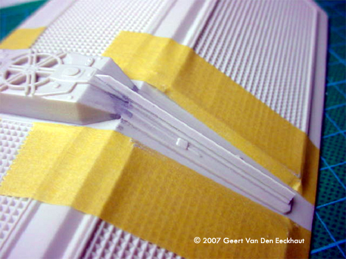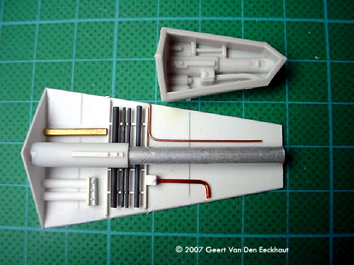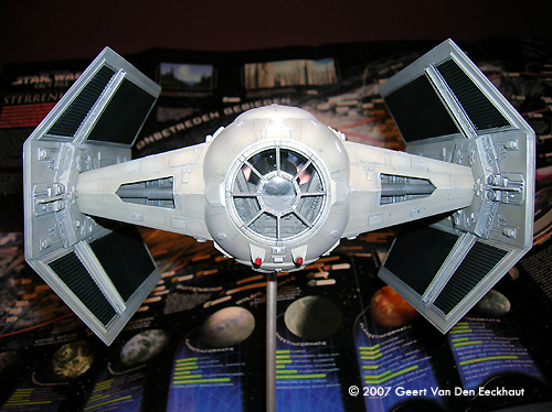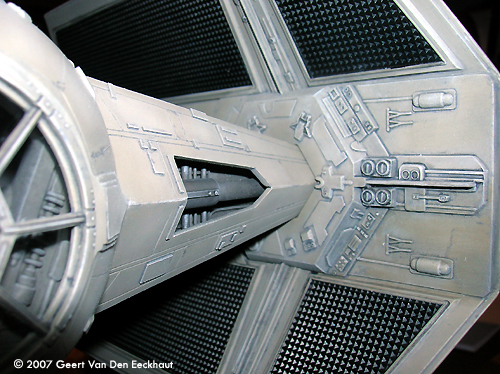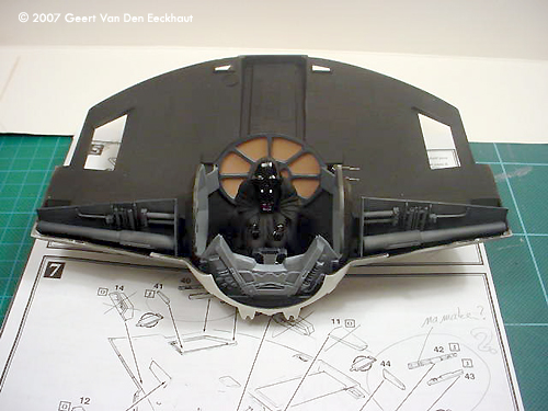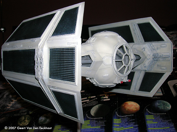 Step 7: Fuselage Upper Half. I dealt with all the boxes in step 4. I glued the hatch to the upper part of the fuselage half and started worrying for step 8.Step 8: Closing Up the Fuselage Well a new problem came in sight. The fuselage has two holes in the shape of a trapezium. Normally you should glue -before closing the two halves- four walls on the lower fuselage. These close the gap between lower and upper halves. I let the details on these parts inspire me to make my own. I first glued the halves together, then glued the walls in place. These were voluntarily made too large so that I could cut them to the appropriate size when installed. And then I got myself scratching the details so that these would become a point of interest for the viewer. The eyeball windshield- again I used the kit part as a mould to heat form a new one much thinner and much more transparent. You can glue this with Kristal Clear to its frame. Again I followed Ward's advice and rescribed all the panel lines, remember you have to create those on the eyeball itself, AMT forgot them. Use the drawings from the official Star Wars Fact File on the advanced Tie Fighter. The other parts left do not present a problem, just the back plate doesn't fit. I sanded this part down so that I rescued the details molded on this part which I glued to the new one made from plastic card. Step 9: Solar Panels Not much to be said. I sanded all the sides. They are too thick so I got them thinner, more to scale and replaced the small ribs on the outer side of the panels with new ones. Step 10: Blasters Once I bought a small set from Rocco with light bulbs in different colors: blue, red and orange. They were meant to dress up cars in HO scale. This set always came in handy. I cut off the plastic representation of the guns and put two new laser guns in place, made of transparent red plastic. Step 11 & 12 - In Flight Display Since I never meant to squeeze my Tie into a piece of Plexiglas, I skipped these steps. Done! And now the paint job. |