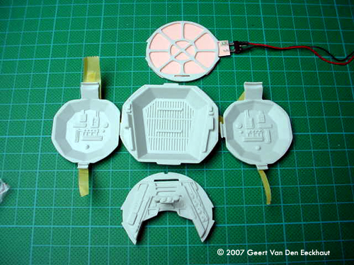 Image: EL sheet Image: Testing.... Image: Cockpit parts, ready for paint Image: New, more detailed wing inserts Image: New detail 'box' in place Image: Inner wing detail ^ Lower fuselage with cockpit in place Image: Old and new upper hatch Image: Fuselage rear detail to be salvaged Image: Assembling the panels Image: Old canopy used as a master for a new, clearer one Image: Lots of new detail added Image: Chin area - note the new blasters Image: Inner wing detail Image: More ^ Top view Image: Front view Image: All lit up Image: New stand |