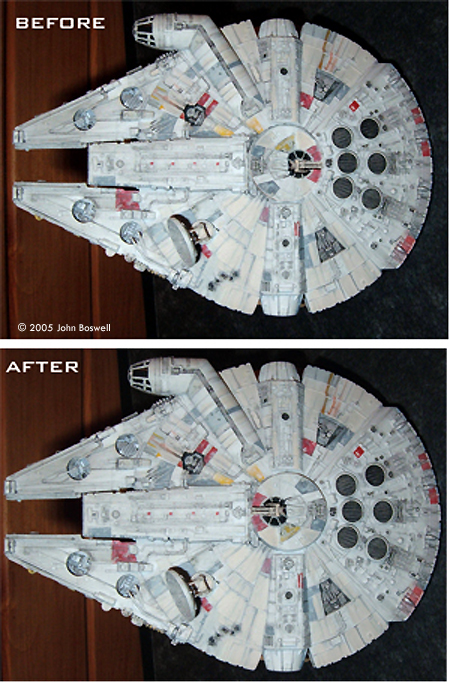 Sensor Dish I added a small spike to the centre of the radar dish and filed all the detail off the back. Looking at the back, the centre disc is from the spares box, and the 8 ridges are Evergreen strip. The framework is mainly steet styrene with a thin tube to connect it all together. I only noticed after I finished the kit that the dish is WAY too big! It needs about 3.5mm taking off the outside edge. Ah well, maybe Lando replaced it with a bigger one after ROTJ hoping Han wouldn't spot it! Quad Lasers and Top Turret The only way to get these was to scratch them. I made mine from a Tamiya 1/35th scale German Infantry accessory kit. I used the handles from 8 grenades to form the barrels, the rest is all sheet styrene. The bottom guns are detachable so I can display the Falcon using a stand slotted through this area. Somehow ERTL managed to mold the top turret bit on backwards, but if you carefully cut round the turret you can remove it with minimal clean-up. Once glued in the correct position I filled any gaps that where left. Sadly I don't have a "before" pic, so I used the computer to un-do my efforts. Extra Landing Gear Bays I noticed something while doing my research that if I used the existing recessed detail panels as a reference and sized my bays to fit to them, they'd be too narrow. I cut 2 paper templates in the shape of my bays and positioned them until they looked right. From there I could draw the outline of the new detail panels. These were cut open and detailed. The gear bay templates were stuck to sheet styrene and, using Milliput to get the right positioning, then attached to the Falcon. Painting Now for the fun part. The base coat was Halfords plastic car primer (white). After it had cured I painted all the coloured panels (grey, red, darker grey, odd bit of yellow) using my references to get it as accurate as possible. Onto the weathering, this was just washes of thinned Tamiya black of various strengths until I thought it looked just right. I guess the trick is to stop yourself just before your happy with it, because undoing overdone weathering is a lot of hard work. REBEL TRANSPORT |