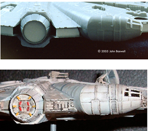 I then thinned out the plastic all the way round, being careful not to melt the plastic as I went along. I cut some long strips of plastic-card approx 3mm wide to make the new side walls. Once in place the Falcon looked so much better, much more like the studio model. The Falcon has 4 recessed holes above and below each of the two loading mandibles at the front. Mine disappeared while I was sanding so I had to scratchbuild them. I used 7mm diameter plastic tubing, cut into 4 rings the same height as the side walls. A thin circle of plastic card was glued half way inside each ring, after which I detailed each side with greeblies. This is the hassle you get for daydreaming while Dremelling! The side wall detailing is just mainly greeblie bits of plastic strip, cut into various sizes just to vary it a bit. I did try to follow the studio models detail along the loading mandibles; the trick here is to resemble it, don't worry if it's not spot on. I used stretched sprue to replace as well as add to some of the pipework on the mandibles; you can see where I put what in the pictures. Escape Capsules The new escape capsules are made from 1/48 Revell F-18 engine nozzles, with about 3mm cut off to fit. I detailed the inside using thin sheet styrene and stretched sprue. Engine The engine is a strip of grooved Evergreen styrene with a thin strip glued half way along it's length. Grooves were filed between each engine flap to better resemble the studio model. Unfortunatley I made my mistake by gluing together each kit half BEFORE painting the engine !! After a few choice Anglo-Saxon expletives I dug out a very thin brush and carefully painted my engine piece gloss sky-blue. Ah well, you live and learn ! Cockpit The cockpit doesn't have the side-frames or any detail at the front. I added thin Evergreen strips at the side and then carefully filed them down to blend them in. For the front I drilled a hole to take a 3mm diameter styrene tube; it protrudes by about a millimeter so the front frames can taper up. The bottom half is Milliput shaped to match the taper of the frames. |