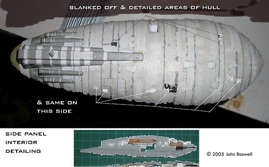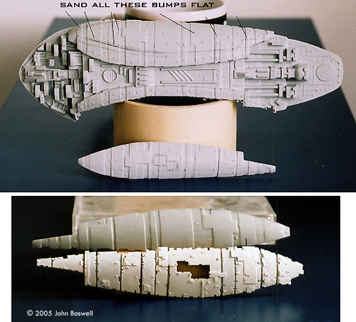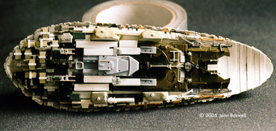 Hull Plating My first step was to cut away the two large lower side panels from the bottom part of the kit. Then I sanded off all the raised details from them and the upper hull. It's crucial not to sand them flat as the kits panel lines will help me keep the new hull plating from veering off track. Here's the tricky thing with the plating: if you cut a straight strip of styrene it won't line up properly on the model. This is because the hull curves sideways and from front to back. So, I stuck Scotch Magic Tape to the model and using the kits panel lines as a guide, drew them onto the tape. I transferred the tape to thin styrene sheet and cut these strips out. These strips look like arcs as opposed to straight strips. I then affixed these to the kit and where they lined up nice and straight. Once the hull was covered in styrene I cut small notches out of the plates, as seen on the studio model. Small bits and strips of styrene were selectively stuck all over the kit, giving it detail and a sense of scale, not to mention giving me eye-strain in the process. |