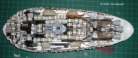 Pilot Pod and Tower Pretty basic this one, the tower was a small diameter styrene rod layered in stretched sprue. The pod itself is scratchbuilt from styrene and Milliput. Engine Recesses These are at the back of the top hull. I drilled them open then filed them out. I couldn't find any engine bells in my spares box so I just used styrene tubing to make the engines. I painted them in such a way as to hide the fact they were cylindrical and not bell - shaped. Bottom Detail This is easily the hardest part of this project, so I'll try to explain what I did in stages. I took a long look at my reference pictures, the underside of the Rebel Transport is fantastically detailed, a real credit to the ILM model builders. My main problem was the small scale of the kit and how to represent it all. STEP 1 - First task was to detail and blank off all the open sections of both the main hull and side panels. Then the underneath of the main hull needed blanking off with thick sheet styrene, which would also act as a base for all the new detail to be glued onto. The back of the hull is too short, so I curved some thin styrene and glued it to the rear underside of the hull. Once dry this was filed and filled to the correct shape. STEP 2 - I needed to know how the side panels would fit so I could build the detail in to the right depth. I built some locating pins from styrene rod embedded in milliput so I could work around the panels but detach them whenever I needed to. STEP 3 - The depth of the hull's underside was built up using more layers of thick sheet styrene, I also glued thick strips along the edges to act as a base for the detailing along the sides. STEP 4 - That's the basics done, now it's time for the superdetailing. The bottom is made up of dirt-cheap kits from eBay, cut, filed, sawed and generally abused in some way to get them to fit in how I wanted them to. Among them are HMS Fearless, bits off 1/72 Apache helicopter, and body parts from 1/72 tank kits. This gave a good detailed base for all the smaller details to be glued onto. These came from the spares box, but I tried to give each piece a sense of purpose. I wanted the bottom and sides to be as detailed as possible without looking random and messy, so I duplicated some parts to give an impression of symmetry. STEP 5 - The cargo pods. If you want to try these DON'T do what I did, which is scratch each individual one, you'll go nuts! Make a few and then cast them in resin, much, much easier. Mine were just made from scrap styrene and Milliput, with thin styrene strips glued over them. These were glued on somewhat randomly, but again I wanted to resemble a working ship so some thought went into it. STEP 6 - I used the engines from the kit but they're molded very thick. I used a Dremel to thin the insides out. All three are glued onto the same part from ERTL's Slave 1; the middle engine is just angled differently so it hangs lower the the other two. |