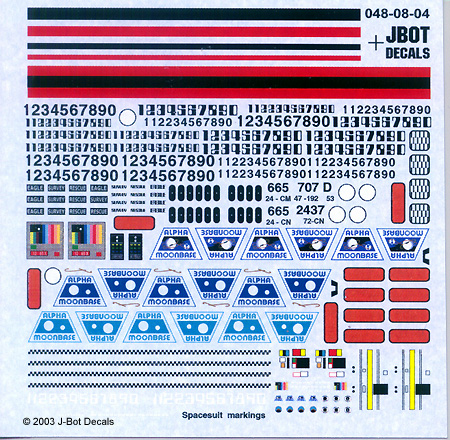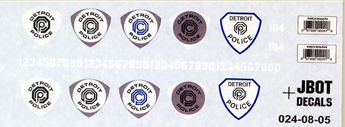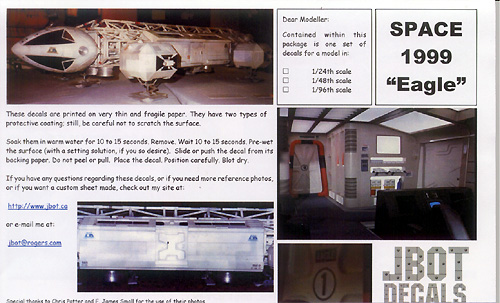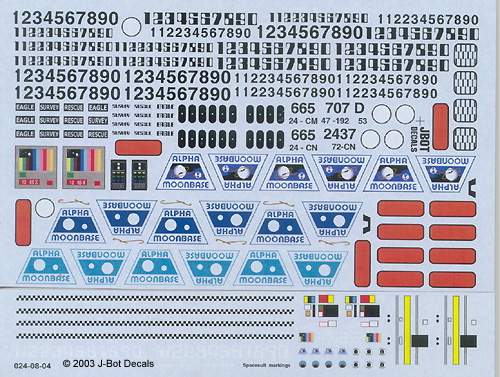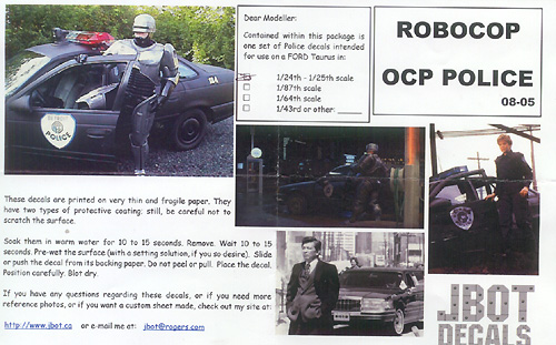Instructions include one or more color reference images to help with placement, as well as text describing how to use the decals. They're clear and easy to follow. Starfighter Not having a Starfighter to compare against at the moment, I can't say how well the decals will fit where they're supposed to go. They certainly look accurate enough, based on the references I have. There should be no problem finding spots to place the kill markings on various Star Wars ships - and there are two scales available, so you should be able to provide an impressive tally to any of the available fighter kits. As a bonus, shoulder/helmet patches are included so you can properly outfit the pilots as well. Eagles Three sizes/scales of decals are available to dress up your Space:1999 Eagle Transporter kits: 1/24 (44"), 1/48 (22") and 1/96 (11"). Markings - which are primarily based on those applied to the 44" filming miniature - are included for both Season 1 and Season 2 Moonbase crests, including gold accents; numbers and stencils to make any style of transport (survey, rescue, etc.); checkerboard and striping; various internal and external panels and stencils; and even astronaut shoulder patches. As with the other sets, printing is sharp, perefectly registered and clear, though the smallest markings (except blak ones) are just a little fuzzy due to the limitations of the printer. Still, they're quite acceptable. The instruction sheet provides hints for using the decals and a selection of reference images from the actual studio models. It would have been helpful to include a diagram that explicitly deliniates where each marking is to be placed. A careful search of online resources should provide enough of that info. OCP Police Cars The 1/24 (1/25) decals for RoboCop's OCP police cars is as nicely printed as their other sheets. An advantage to the ALPS-printing method J-Bot uses is that it can replicate metallic colors through the use of metallic cartridges. This is shown to good effect on the Robocop sheet. The markings appear quite accurate; you get five styles of door shields covering the different vehicles shown in the movies, a set of stencils to make any number vehicle you choose, and two bar-code license plates. About the only problem I see with this set is finding the appropriate model Ford Taurus to convert! Conclusions These sheets are welcome additions to the sci-fi kit aftermarket, and I look forward to seeing more from this producer. The price is quite reasonable for what you get. I highly recommend these if you have the models on which to use them. Many thanks to J-BOT Decals for providing the review sample. Manufacturers and retailers, interested in getting your wares reviewed and publicized on a site averaging 3000+ readers a day? Contact us! |