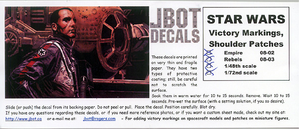 J-Bot Decals have been around for several years, catering mainly to auto and aircraft modelers. Lately, they have branched out into sci-fi. Their first two releases are supplementary markings for Monogram's old Buck Rogers Starfighter and kill markings for Star Wars ships.