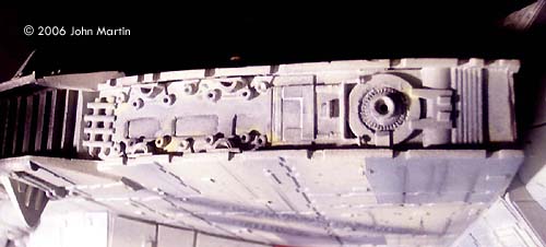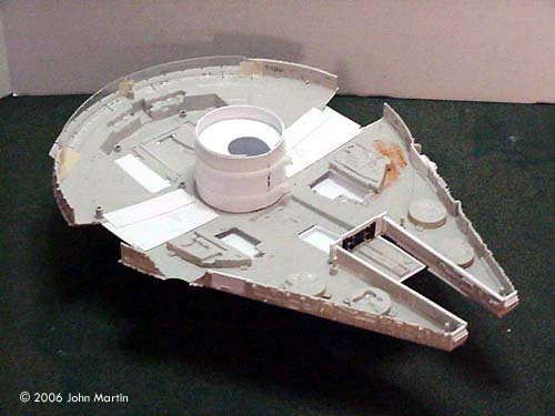 A cutaway version, which used most of the parts from the original version, was also available from AMT/Ertl. Recently (as of 2006, when this was first written - Ed.) both the original kit and cutaway versions have been available, in new packaging, reissued from AMT/Ertl. (As of late 2015, a new kit of the same size was issued by Revell, which builds into either original trilogy or SW:tFA versions. It's available here). Built straight from the box, the Ertl kit is impressive, but not overly detailed or accurate. To the casual fan, the kit is recognizable as the Millennium Falcon. However, there are a number of structural inaccuracies that make it look not quite right. The most glaring is the over-sized sidewalls. This is one of the factors that give the kit a flat, “hockey puck,” shape. The cockpit and tube are too small proportionately to the hull. The dish is too big. The sidewalls, engine deck, and most of the hull lack the appropriate details, or “greeblies.” I had first built the Ertl kit in the spring of 1980, shortly after receiving it for Christmas. I will not lie: my first pass was really sad. The huge gaps between the hull sections and sidewalls were filled with toilet paper soaked in glue. Only a few panels were painted Testor's gloss red and gray. I never even tried the kit lighting; I just painted the engine bright gloss green. True, I was only eleven at the time, but even then I knew I could do better. However, I must confess that I spent more time playing with this Falcon than the Kenner version, which I also received that Christmas. Years later (in 1995 in fact), I came across an article in Sci-Fi Modeler by a gentleman named Darren Peters. In the article, Mr. Peters detailed a number of structural changes he made in order to make the kit more accurate. Most significantly, he cut the sidewalls to a smaller height, rebuilt the cockpit cone docking rings, and built the forward landing gear bays (which were originally added to the “real” Falcon sometime after the Battle of Yavin). When I came across the article, I had been trying to improve the AMT/Ertl X-wing kit, and had just finished the Star Trek: Voyager special edition kit. I thought that it was time to add an accurate Falcon to my shelf. All it required was a little scratch-building, right? Naming Conventions In order to be clear in the discussion, I will borrow the terminology used by Robert Brown.
