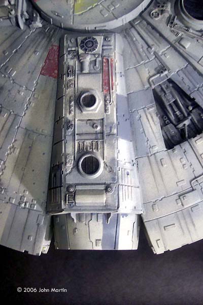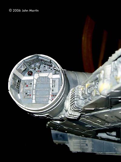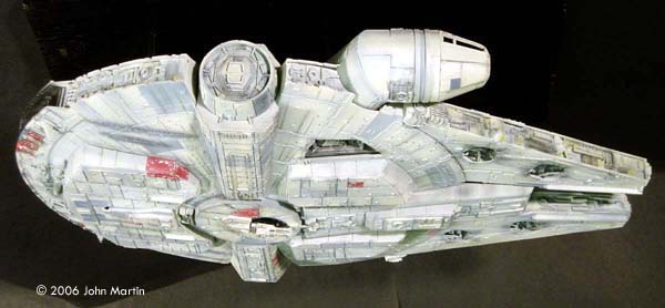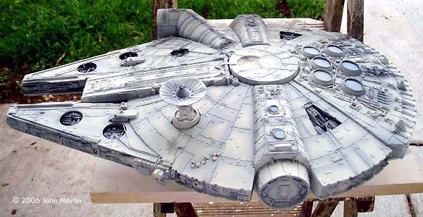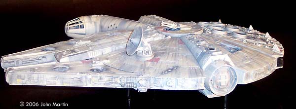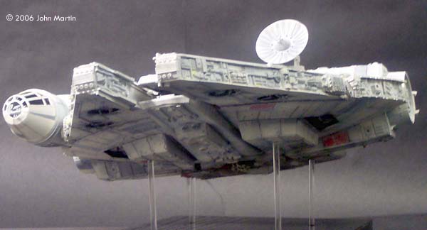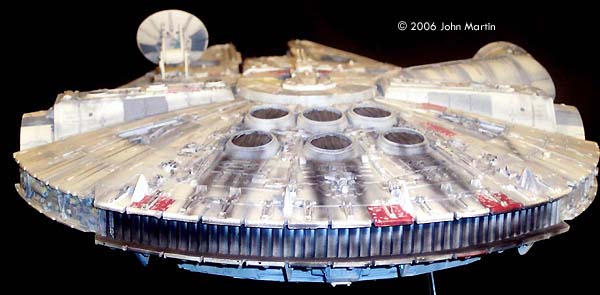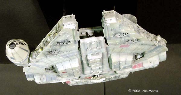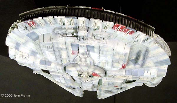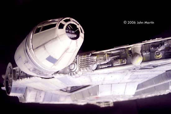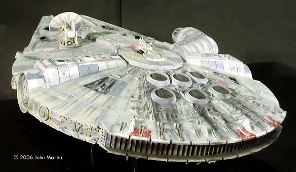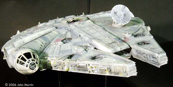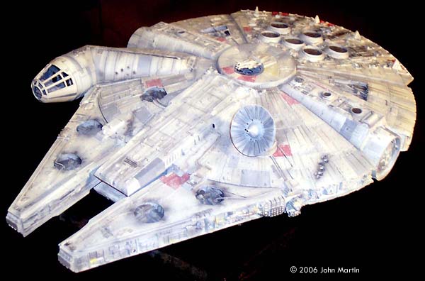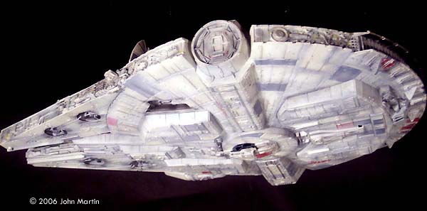 The fictional Millennium Falcon was portrayed by a number of studio miniatures and full-size sets. The first model of the Millennium Falcon built for Star Wars (Episode IV) is a massive prop, with a length of 173 cm/68 inches (Star Wars Chronicles, p. 95). Portrayed on screen, its maneuverability is the result of motion-control camera work. For The Empire Strikes Back, a smaller version was built that would be easier to control in action scenes, such as the famous asteroid chase. |