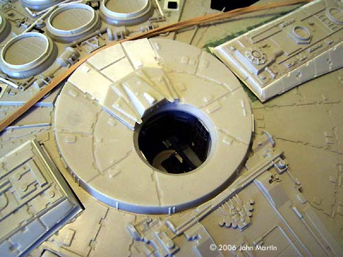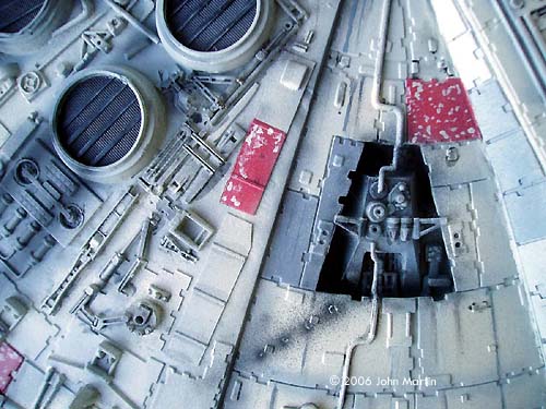 Hull Details Bits and pieces from the aforementioned parts box, along with strip and rod styrene, were used to “busy up” the thirteen mechanical bays. For each of the mechanical bays, the plastic around the hole was shaved to make the hull appear more “in scale.” In some places, some of the greeblies molded onto the hull that did not look quite right were sanded off. The “fins” along the inside mandibles were cut off. Various structures that are prominent on the ESB model were added, including the “A”-shaped tubing near the cockpit. The box devices on the top of the hull (on the dish near the mandibles) were removed and scratchbuilt to match the ESB version. The battle damage behind the dish and along the lower aft quarter was drilled and cut using a rotary tool. The massive “scars” on the lower port quarter were also added with a motor tool. Along the edge of the dish, small rectangles were cut out from the overhanging plates. Finally, many additional rectangular “chips” were added to the hull. |