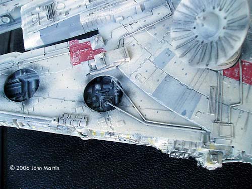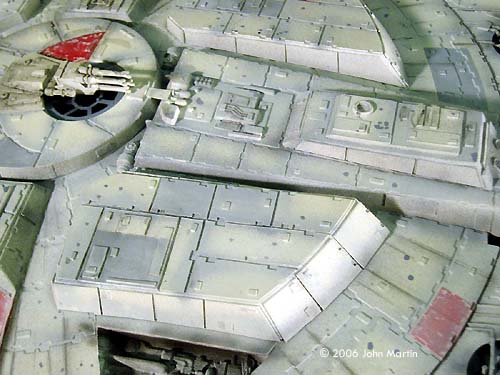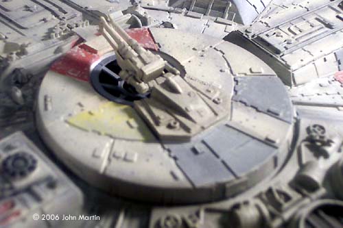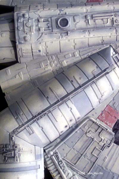 Painting and Weathering The completed model was first given a coat of gray automotive primer. At this time, some surface flaws, such as scratches from sanding, were addressed. Then the model received a coat of flat white. (White primer paint would have been preferred, but I never seem to find it in the stores.) The thin-line nozzle on the airbrush was used to pre-shade the model. The panel lines (between the armor pieces), structure joints, and greeblies were traced with flat black. At this time, the engine vents, docking arm screens, and mechanical bays were painted black and masked over. After quite a bit of research, I decided that the best base color would be camouflage gray (FS 36622) . This was sprayed over the pre-shaded model in thin, mist-like coats. Along the sides and the engine deck, I used very light coats, however, in places where I wanted the pre-shading to be more subtle, such as the armor plate joints, I used slightly heavier coats. Individual panels were masked off and painted using light ghost gray (FS 36375), dark ghost gray (FS 36320), or a custom brick-red color that I originally made for my 1/48 A-wing pair. After the panels were painted, a small brush and the base color were used to simulate paint chipping. The model was then given an overcoat of Future acrylic floor polish. After this had dried, black and gray artist oils, mixed with quite a bit of thinner, were used to bring out many of the details. After a day, I went over much of the wash with cotton swabs and small paper towel balls soaked in thinner. (As with my previous models, I have to give credit to Alfred Wong and his weathering article for guidance with this.) It was difficult not to overdo the wash. I continued to check my reference photos. After I was satisfied with the result, I used Testor's Model Master dullcoat to seal the oils and remove the gloss from the Future coat. Black and dark gray were airbrushed in various places to simulate exhaust, dirt, or blaster damage. The base coat was dry-brushed over some of the darker detail sections, notably the mechanical bays and rear engine deck. The streaks that radiate along the dish from the central core were added by pencil and artist's chalks. Finally, very thin coats of the camouflage base color were applied overall to bring it all together. |