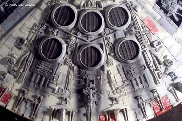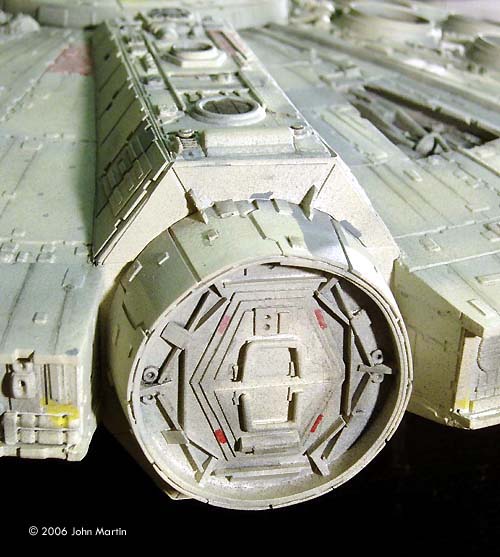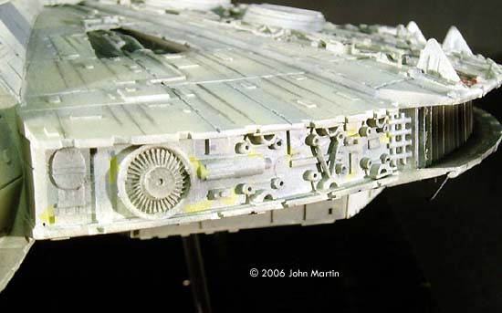 Using a draw program, I sketched out the rough size and relative placement of each of the “greeblies.” Rectangles were cut from sheet plastic, and the details were glued to them before mounting them on the hull. Bits of unbuilt kits that somewhat matched the various structures were used, but unfortunately most of the details needed to be scratchbuilt. Except for a small part of a 1/24 scale NASCAR model, the structures at the aft end of the mandibles (represented on the ESB model by a Porsche transmission) were scratchbuilt by sheet plastic. The dome slightly forward of the cockpit is the head of R2-D2 from the MPC X-wing kit. Because of the decrease in height at the sides, kit part #7 (upper and lower) that sits inside the upper and lower jaws was modified. The edges were trimmed such that the part would sit inside the jaw sections, and not on top of the edges. Part 68 (x2), between the mandibles, was not replaced, but was cut to the correct height. Gun Turrets The interior of the gunwells were scratchbuilt by cutting eight rectangular sections and attaching them to the octagonal back wall. The gun chair and targeting computer were included. Since very little is able to be seen in the completed model, there is not a lot of detail, but the walls do have different colored panels that give the impression of the original set. The quad guns were scratchbuilt using bits from the kit guns and sections of sheet plastic. The gun mounts were raised a little higher than stock by mounting them on thick sheet styrene before attaching them to the kit. Engine Grill I never decided until near the end whether to light the engine, cockpit, and gunwells, so clear sheet plastic from a broken poster frame was used make the engine exhaust opening. Vertical ribs were cut from sheet and spaced 0.4 cm apart in order to represent the engine grill. I eventually decided to not light the model for three reasons. First, I have no experience with lighting models and did not want to learn how to on this. Second, I was not interested in having a battery access door or an electrical cord running out of the hull. Finally, near the end of this build Fine Molds announced their 1/72 scale Falcon. Maybe I will try to light that one. This means, however, that I am not very happy with the engine grill. I considered painting a bluish-white strip, but in order to make that look accurate to the movie I would have to paint the engine glow around the engine light blue. I finally decided to leave the engine as it is. |