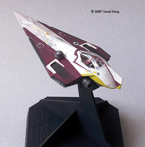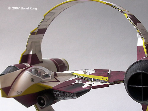 Weathering the Hyperdrive Ring Even though the decals provided are clean and unblemished, the Delta-7 seen in Attack of the Clones is quite worn. No where near as beat up as an X-Wing, but not as new as a TIE Fighter either. Watch the movie with an eagle eye and you'll notice the amount of weathering on the 'real' thing. Now's the time to chip the red and yellow decals, ever so subtly. Remember that we are working in 1/72 scale, so the chipping must very small. Add the around leading edges, panel edges, and where flying debris may strike. Then dry brush some silver highlights over the edges to make it look like bare metal is a very few spots. Dark gray/black streaks shot through the airbrush with a very fine setting completes the weathering. Keep aware that this is all in 1/72 scale, so keep to weathering effects small. Building & Painting the Starfighter Like the hyperdrive ring, the ship was painted in gloss off-white. As I was building it as an in-flight model, I assembled it with the landing gear closed. Building and painting the cockpit is tricky because of its compact size. Tiny decals replicate the instrument panels and a seated Obi-Wan figure is included. The second smallest part of the kit can be found in the cockpit, which is the pilot's HUD screen. The smallest parts of the whole kit are actually the four laser cannon tips, and a pair of spares are included in case you drop one. Handle these in a bright, clean area with a pair of very sharp tweezers. Believe me, no adult human has fingers small enough to pick them up. Careful study of the CGI Delta-7 reference images reveal that some of the panels have subtle gray shades on them. They are symmetrical, which means that they are not worn sections but rather have been purposely painted on as markings. I mixed off-white with some light gull gray, masked and airbrushed the appropriate gray panels. Another section that requires some minor paint work is the underside of the engines, where they are exposed under the fuselage. The paint guide calls for gun metal, but they are actually white with a band of red at the rear end, where the thrusters emerge.The middle section of the underside also needs to be painted gun metal, a detail that the instruction sheet left out. If you do not have the making of AOTC book, the asteroid chase sequence and the deleted scene of Obi-Wan leaaving the Jedi Temple found on the DVD serves up some decent shots of the underside of the Delta-7. The raised ring that R4 attaches to also needs to be painted red as the decal does not reach up to this area. The entire rear engine section was painted gun metal then dry brushed with silver.I found it easier to paint the ship in subassemblies consisting of the top, bottom, cockpit and engines before assembly. The canopy was left off and installed after the whole model was completed. There is a white frame around the perimeter that needs to be painted. I did this with a brush as the small size and curvature made masking very difficult. Decaling the Delta-7 The four main decals that make up the red sections of the ship will need lots of patience and Mr Mark Softer to set right. Do not worry about covering up the model's surface detail as it will show through after the decal softening sulotion does its work. As before, trim the decals right up to the edge because any extra carrier film will cause problems with alignment, or overlap and leave rasied corners. The instructions fail to call out the decals that go along the side edges. But they are there on the sheet, and it will be obvious what goes where as you progress along. There is a mistake on the decals that is easily rectified. The laser blaster tips on the ship's underside actually have the white square outlines around them just like those on the upper surface, but these are missing from the decals. FineMolds thoughtfully provided a bunch of extra markings for builders that would have preferred to paint the red sections instead of using decals. Amongst these extras is an extra pair of white squares. Use these for the underside laser tips. The tiny red cowls of the laser blasters have equally tiny red decals that go over them. A drop of Mr Mark Softer will set them right. A tricky decal to apply is the tiny red stripe that goes on to the top of the canopy. Trim carefully, and use small amounts of Mark Softer to avoid staining the clear plastic surface. Another pair of scary decals are the two large red sheets that go under the cockpit. Many have given up and just painted this area instead of trying to get the flat decal to conform to the compound curve. Once again, Mr Mark Softer and plenty of patience will see you through.Because of the surface shape, the decal will wrinkle like mad once hit with softening solution. I waited out, and an hour later it dried totally flat. Once totally dry, I chipped away some of the decaled surface to simulate paint wear. Weathering the Delta-7 After filling in the tiny panel lines with a wash of very diluted black, I clearcoated the ship with matt in preparation for drybrushing. The ship in the film had a moderate amount of wear on it, more so than many casual fans assume that there was. Silver was used to very lightly highlight the raised edges for more definition and simulate paint worn down to the metal. This was done with a very light hand. A mix of matt black and steel was spat from the airbrush in very small bursts to streak and dirty up the ship a little. The trick here is to apply weathering where you would expect the ship to be worn in real life instead of just randomly blasting away. Less is more in a case like this. Also consider that at 1/72 scale a heavy handed weathering application will look way over scale. Putting it Together Once complete, you can opt to display the ring and ship seperately or combined as one. I painted the bases matt black, to keep them neutral and also to visually recall the blackness of space.Conclusion I took close to a month to put this kit to