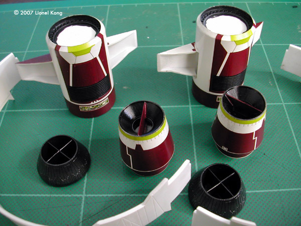 Detail is superb, matching the actual CGI model of the ship almost all the way. It is not perfect though, as the painting and decal guide omitted some details that we will get to during the build. The kit also comes with parts for two stands, one for the hyperdrive ring and one for the ship, should you wish to display them separately. Building the Hyperdrive Ring Even though the instructions start from the ship, I suggest building the hyperdrive ring first because it is actually the more complicated item of the two. Yes many have said that this model has so much decals covering it that the base coat of paint would only be a hint. But that is no excuse for getting lazy. Instead of pure white, I found that Gunze's acrylic off-white to be a better shade in this scale. All colors used were gloss, taking into account all the decals that had to go on later. A matt clearcoat will be used to tie in everything once complete. There are also a fair bit of details that need to be painted, but are sometimes missed because the instruction sheet is so cluttered with decal numbers. On the hyperdrive engines, the side grilles need to be painted black, a gray stripe runs down the center of the middle docking clamp, and there are two small red lines on either side of the main docking clamp's upper surface. It will help if you mask and paint outside the lines a little around the engine grille. This is because a decal surrounds the whole grille, and any gaps will need to be touched up later. On this kit, it really pays to study the instructions well. The paint numbers match Tamiya and Gunze Sangyo acrylics. You can easily find what colors they mean by using the Tamiya website. I built the hyperdrive ring in the following subassemblies for easy decaling: