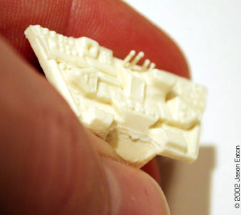 Manufacturer: Falcon Kits By Rob Caswell If you're a fan of the Millenium Falcon and a sci-fi modeler, then you're probably no stranger to the disappointment brought on by the MPC/ERTL kit. So close....yet so far away. The upper and lower hulls were pretty accurate reproductions of the craft, but those side panels. That cockpit. Gods - they're just makin' this stuff up as they go along! Well, it's been almost 25 years, but our Knight in Shining Resin has finally arrived. Falcon Kits (aka Jack Smith) has recently offered a series of accurizing kits for this venerable SF classic. These sets address both the kit's innaccuracies and the dispartity between the "Star Wars" Falcon and its "Empire"/" Jedi" configuration. I've got the first two of these sets, though I haven't yet installed them as I write this. The first set offered by Falcon Kits was the "Guts on the Outside" (aka "Side Panels") accurizing set. The ones which come on the MPC/ERTL kit are not only incorrectly detailed, but they're also too high. Using these stock parts results in a kit that looks more like a Kenner toy than a scale model. The accurizing set comes with replacement panels, a new lower cockpit tub, and complete, cleanly laid out instructions on how to install them - PLUS make the modification to the overall height. If you only get one set, this is it. From photos on the web site, it can clearly be seen that this makes a world of difference in the kit's appearance. The second set tackles the cockpit problem. It provides new instrument panels, back walls, chairs, and window glass. Like the "Guts..." set, it comes with a complete, illustrated instruction sheet. All quite professionally produced. The third set is due for release in July '97. It provides the extra gear wells sported by the Falcon in the final two movies. This is the easiest of the above modifications, but it's still cool to have a set available if you want to take the short cut. As many of you probably know, product quality can vary widely with cottage industry companies. So part of me wasn't expecting miracles from the Falcon offereings, while another part of me was loaded with expectation just because I've waited sooooo long for a set of this type to be produced. What finally arrived blew me away and EXCEEDED my expectations. These sets are well worth the money you pay and the care in their production is rare in this small-production field. The sets came in a small, sturdy box with the contents well packed in bubble wrap and "peanuts". The parts are molded in white resin and the casting is wonderfully clean. There were no significant airbubbles to be found and all the parts were cleaned of flash. The detail was remarkably crisp and all parts were hand labeled on the back, then glued to a sturdy cardstcok backer with (water-soluable) white glue. Its' clear a lot of work went into preparing this package even AFTER the parts left the mold. Combine those exquisitely crafted parts with crisp, laser-printed instructions, and stock for cutting clear parts and you have one fine package. Though I haven't yet incorporated these into the finished model, I have little doubt that a manufacturer who puts this much care into making and mailing these parts would not drop the ball on the assembly phase. I would not hestitate one second to recommend this set to the serious Star Wars modeler. It's well crafted, completely accurate (as far as I can tell), and at around $30 for sets one and two combined, its more than reasonably priced. RATINGS (1=stinky, 10=Ooo-la-la!):