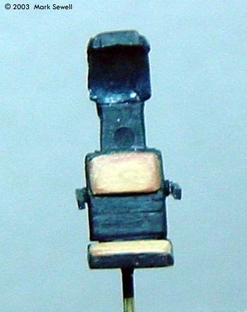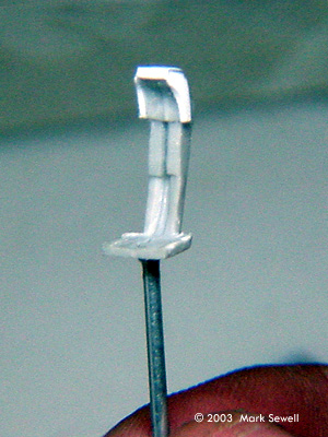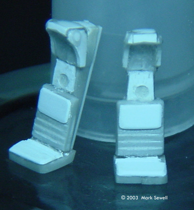I began to collect the best possible reference photos for this project. I managed to collect a good set from various web sources in addition to a small but good photo from the Topps ESB 3rd series of trading cards. This turned out to quite valuable because it shows a framework located on the back of the seat that otherwise you wouldn't know is there. Seemingly absurd but, for the detail maniac it was a must. I felt that the seats looked a lot like the seats found in modern day aircraft. This started the gears turning. I found the base of my seats from a Hasegawa 1/72 F-14 Tomcat kit that I had lying around. I know that the scale of this kit has been debated but I decided that 1/72 scale is the scale I would use. The kits seats are assembled with three parts, two for the frame and one for the seat cushions. This would work to my advantage because only slight modifications would have to be made to the frame pieces in order to arrive at the shape I was looking for. I assembled the seat frames first. The seat cushions I thought I would discard in favor of making my own but as it turned out I could use the larger section of the tiny piece and I proceeded to cut away to rest of the cushions with a sharp knife to arrive at the piece I needed. The ejector seat frames would need a little more alteration before I could begin my work at the conversion. The frame had bits of detail on the outermost edges that needed to be removed. I did so with a sharp knife and a set of jeweler's files. At this point I seemed to me almost a futile effort because I could have scratch built the frame but in my opinion the less I have to fabricate the better off my sanity would be. With the frame cleaned up I finally could start my modifications. I started by addressing the headrest. Initially, I mistakenly made a cut to the back of the headrest that I later would have to correct. The reference pictures show a curvature to the headrest and to model this I made an initial cut with my knife, then shaped it crudely with the jeweler's file using a half round profile. The pictures I had showed the headrest flared out from the "stalk" of the frame assembly so I needed to build up the headrest with sheet plastic. Choosing a gauge of plastic that would give me the right width I cut four sections of plastic and glued them to the headrest section of the seat frame using medium cure Zap-a-gap. At this time I chose 1/16" aluminum tubing to act as the pedestals of the seats so that I could hold onto the seats while I worked on them. This later would be changed to .032 brass rod, which seemed closer to scale. Next, I began to shape the plastic with a combination of course, medium, and fine flex-pad sanding sticks. Because of the "filling" quality of the Zap-a-gap I was able to sand the form very thin where there is curvature toward the top of the headrest. With the headrest done the next step was to create the cushions for the seat. Using the large section of cushion that was included with the original ejector seats and cut earlier I glued it to the frame, then filled in the scribed lines on the cushion with Squadron white putty. I continued by adding a lower cushion cut from the same stock of sheet plastic that I used for the headrest form. The lower cushion is a small section at the base of the frame and after gluing the sheet to the frame I used jewelers files to create the final shape. Finally I added a panel to the upper portion of the frame that lies between the upper cushion and the headrest. Now it was time to test the limits of my patience and detail the two seats. I started with the framework on the back portion of the seats. This took fourteen pieces of .020" square styrene rod from Plastruct. I glued the sides of the frame first and inlaid the individual pieces separately. I used the fastest setting Pacer Zap for this process. Invariably I would end up with "pools" of glue that I quickly soaked up with a dry paper towel to maintain the relief that I wanted. |