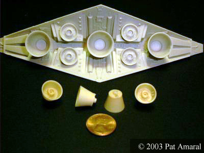 This kit, now long out of production, suffers from major innaccuracies and gross lack of detail. It represents the basic shape of a Star Destroyer but little more. In recent months, Odyssey Slipways has begun producing various replacement parts and detail enhancement kits aimed at addressing these shortcomings. This preview is of two of their latest releases. What You Get: Dorsal Details Kit #1 Packaged in a small plastic bag that was shipped via US Priority Mail, securely packed in a sturdy cardboard box and protected by lots of shredded paper, are 11 of the tiniest cast resin pieces I have ever seen (along with one short strip of styreen). The resin is smooth and almost completely free of flaws. I found one bubble on the largest piece and it is so tiny that it will probably get hidden when the thing gets painted. The parts in the Dorsal Detail kit are intended to enhance the details at the top of Star Destroyer's nose section. The existing surface details on the upper hull (Ertl kit part no. 1) will have to be removed prior to installing the details from the kit. All of the pieces look like they'll clean up easily as the pour stubs are very small and only three of the pieces have any appreciable flash (which is really suprising considering how small the parts are). All of the detail is very crisp. The six tiniest pieces are connected to a spur of resin (three parts each on two spurs). Although experience with cleaning and working with tiny resin parts will be helpful, anyone with some patience should have no problems with this kit. Chris Proctor of Odyssey Slipways thoughtfully included a tip in the instructions for removing the parts from their spurs safely. I have yet to try this suggestion of dragging the spur across a piece of sand paper under your thumb though. I compared the kit parts against pictures taken of the filming model used for The Empire Strikes Back when it was on display at The Magic of Myth exhibit. The parts are a little too thick for the scale but I can't see how Chris could pull this kit off if they were any thinner. One concern I have is that with all this cool detail getting added to the front of the ship, will that overshadow the lack of detail on the rest of the model? Thankfully, there are additional detail kits being planned. What You Get: Secondary Engines This is the second release of a line of replacement parts intended to "accuratize" the Ertl Star Destroyer kit. The first release was a kit that included parts to replace the main engines and was the topic of my first preview of Odyssey Slipways' products. The parts are packaged in a small plastic bag stapled to a card. My sample arrived via U.S Mail in a study cardboard box along with some other samples to be previewed. Everything was protected by shredded paper. Nice choice of materials - there is little if anything there to hurt the environment and I appreciate that. The kit is made up of four identical castings of the Star Destroyer's small (emergency) engines. Details are crisp and appear to match those of the ESB filming model quite well. The resin in my sample is smooth and free of surface flaws. One of the engine bells is slightly out of round but will not be a problem to fix with some warm water and gentle persuasion. The tiny pour stubs will be easy to remove with a file and sand paper but this may not be necessary depending on how one uses this kit. |