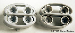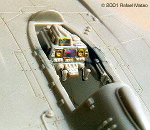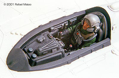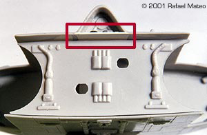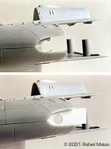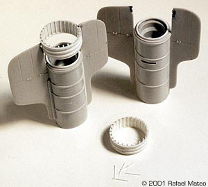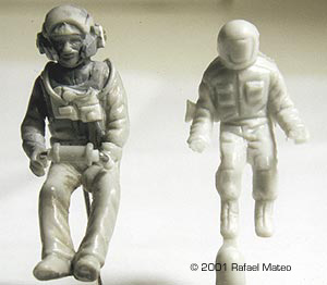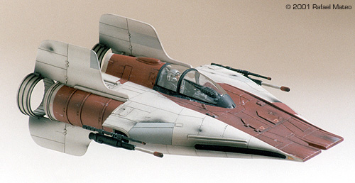 1.- PILOT The pilot supplied on the kit is too much small and the flight uniform and equipment isn't right. I got a new pilot from a 1/48 helicopter kit and it was transformed to get a good A-Wing pilot. I modified the helmet using modeling putty and small plastic parts to get the right shape. The flight suit was carved on the plastic figure and the chest pack was made from different thickness plastic. The ear globes were made with modeling putty.2.- THE COCKPIT First, I filled the holes for the canopy pins with plastic bits and putty and built the inside walls and floor with 1 mm. sheet styrene, taking care to keep free space for the pilot. The upper side on the main console looks right and only some plastic bits were added. The front side, however, is really poor so I detailed that part using photo etched details, electric guitar strings and some scratchbuilt plastic parts. Finally, I put two bits of hologram on two screens to simulate electronic images. The side consoles was scratchbuilt matching a IL&M model photo.3.- THE CANOPY This clear part is very irregular and it cause major transparency distortions. I cut the snap-fast pins and the front wall off. I then sanded the part entire part with medium and fine sandpapers. After this I used Tamiya's polishing compound to remove scratches and restore the original transparency. 4.- THE PANEL LINES I removed all the raised panel lines and rivets, and rescribed them carving with a scriber on the main hull parts and the stabilizer wings. I added the lost lines around the side cannons axies. 5.- ENGINE PARTS The main problem with these parts was that they were poorly molded with a irregular, not just a circle, shape. I worked on them with sandpapers and files where the shape was too much high, and modeling putty where it was short. I removed the last ring on the rear end of the main engine cylinders, replacing them with two new and perfectly circular-shaped rings from styrene sheet. The new rings hide any distortion in the rest of the engine. (A). The thrust rings are poorly shaped as well and are hard to repair parts. I removed them and built two new rings from scratch. I used a 19 mm cylinder to vacuum form sheet styrene, from which I cut the two basic rings. The details were added with 0.4 mm sheet styrene outside and 0.25 mm inside. (B). The rebuilt engines look much better than the kit parts.6.- PARTS THICKNESS The excesive thickness on some parts that are visible on the finished model are clearly out of scale and a serious fault for any model. I thinned the rear zones of the main hull parts from 1.5 to 0.5 mm. and the stabilizer wings to half of the original thickness. The end cap was really bold. I removed the four thruster jets to thin the inside of the cover chassis. The four exhausts was cleaned and completed with plastic tube before pasting them in their places again. The new exhaust are about 1mm. shorter than the original because they must not be at the same level than the cover chassis. This part looks now more accurate and closer to the studio model. Another part that has to be modified is on the back side of the fuselage. I added a little plastic strip under the rounded triangular shape to complete it. 7.- MISSILE LAUNCHERS These zones have a irregular and were not deep enough. I cut them and pasted two plastic strips inside the fuselage to get a uniform 1.2mm. depth on both sides. |