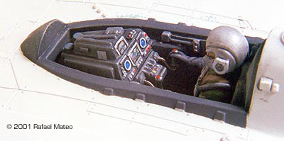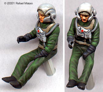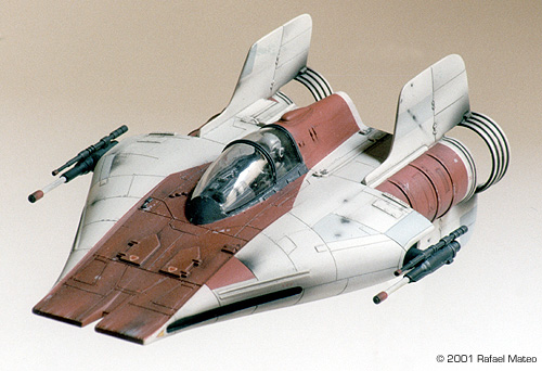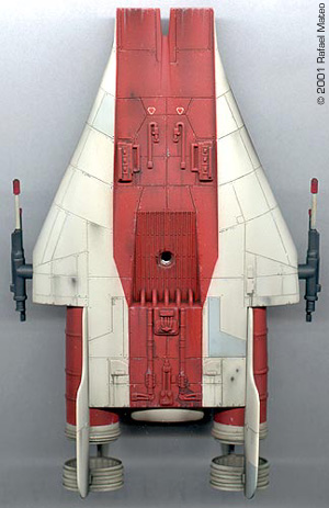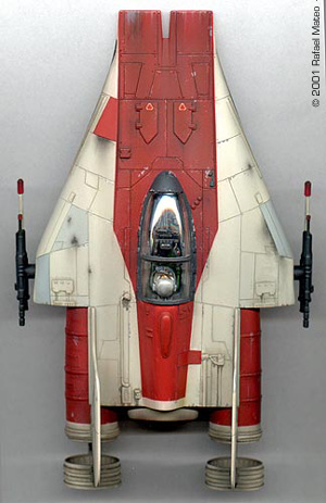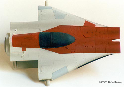 Finally, I covered with sheet styrene the areas to receive the side cannons because it was poorly molded and a huge gap would have been visible when the model was finished. After that, I pprepared to paint. PAINTINGI did not attach the completed engines and the laser cannons to the main body to make the painting work easier. These parts can be affixed after painting without any problem. First I painted the pilot and cockpit. I slid him into position and then and I glued on the clear canopy, filling and sealing with Milliput putty all the flaws. This putty is easy to use, water soluable and won't damage or mark up the clear plastic parts. Then, I masked with Tamiya masking tape all the clear areas (except the canopy frame) to allow painting of the rest of the model. The main painting starts by applying several thin layers of coating primer. Next I applied the basic colors using these Tamiya acrilyc paints: