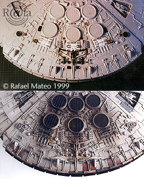 Fifth: Super-detailing the upper main hull The kit's rear part of the upper main hull does have not a great details. However, we can change it using selected parts from other model kits, trying to match the look of the IL&M models. I also detailed the upper outside of the cockpit towards the ship's center. Sixth: Painting the Millennium Falcon It is really important to get good photos from the original models. There are many good books we can use for this. I used Tamiya acrylic paints and artist oils and: |