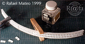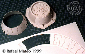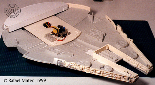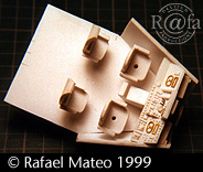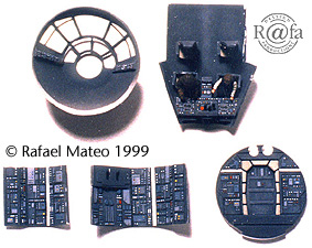 The two main hull parts are well molded and detailed but the same could not be said about the side panels, cockpit and other parts. I spent the bulk of effort on this kit correcting the side panels, cockpit, escape pods, engine grill and super-detailing the upper main hull. First: The side panels The side panels are poor detailed and really out of scale. The model seems the Kenner toy if we use these parts - it looks "fat". We can choose two options to correct this: we can scratch built them or we can buy the "side panels set" from Falcon Kits. I chose to buy Jack's side panel set for this model. The "side panels set" are good resin parts that accurately replicate the look of the studio model. I found only one little problem: I needed plenty of patience and putty fill in dozens of very little air bubbles. Really, that is not too much work to get a great change in the quality of the model. Second: The Cockpit I used the Chewie and the unknown figures, but I did not use any of the kit parts in the cockpit. This is the poorest cockpit you can imagine (a clear part for the back wall and door, and a floor with only two seats, without any kind of detail or instruments). Instead, I made my own cockpit parts with sheet styrene from "Evergreen", as follows: