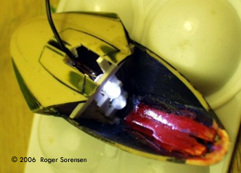 ^ Components Image: Deconstruction Image: First, the nose was re-shaped Image: 'Eyes' were cast in clear resin Image: LED installed Image: Interior of the head