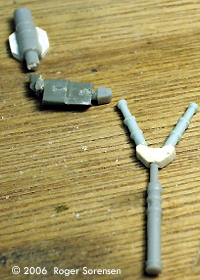 Getting Started To begin the conversion I had to dismember the Droid fighter. Using a razor saw (both large and X-acto tool size), I cut away the four wing / leg pieces and the “head,” then trimmed away the four body panels which, when closed, cover the leg struts. I used Dremel tools, files, and sandpaper to clean excess material away from the inside surfaces of the four panels and to open the “eyes.” Head & Shoulders I had to reshape the nose on the droid head, since it was more rounded than it should be. Sheet styrene and thinned green putty accomplished that. After the putty dried, I sanded it down to shape. I painted the interior of the head black to reduce light bleed-through from the LEDs that would be installed. The eyes are clear resin castings. I pressed fast-set RTV putty into the inside of the head to obtain an RTV positive. I coated this with liquid latex for a negative mold which I filled with clear polyester resin to obtain the final eyepiece. This piece was trimmed and pressed in place to fill the eye openings in the head. I painted the eye piece with a mix of Tamiya transparent red with a bit of Acryl pearl white. I then scored the casting slightly to let more light through for the brighter forward area. Two white LEDS (wired in parallel, with a 100-Ohm resistor in series) inside the head illuminate the eyes and are powered by 3 lithium coin batteries in series (9 volts). The 'white' LEDs have a distinct blue tint, so I painted them with a light coat of transparent yellow to rebalance the color. The wire leading out of the head will go to the batteries. I put together a small armature out of strip styrene to fit inside the head and hold the LEDs in position. I covered the bottom of the head with sheet styrene formed to a compound curve, made by stretching heated sheet over a suitably-shaped bottle. I added sheet pieces and parts box pieces to detail out the area where the neck struts attach. I used strip styrene to build out the side-aft flanges so they have the correct rounded contour, drilled out the inside of the flange and install small bits of 1/16” aluminum tubing for the detail piece. Does it all work? Yes!! Sigh of relief and... on to the neck and body. Neck & Body I made the neck strut from 0.06” and 0.1”sheet styrene cut to shape and detailed with other styrene stock. More sheet stock went into linkages to connect the neck to the head and the body. The body piece needed to have pieces added in the area where the head would retract when in flight mode, and in the interior of the leg strut bays. For the head area, I made an RTV mold off the bottom of the head, a resin interpositive, and finally a resin negative piece which matched the contour of the bottom of the head. I trimmed it to fit and glued it in place. I bored out recesses in the piece to (theoretically) accommodate the neck when the droid head is retracted. Naturally, after the fact is when I find the schematic for what the body aft contour looks like when the head is extended. I lined and detailed the insides of the leg strut bays and covers using sheet and strip stock. More bits from the spares box serve as hinges. Legs The struts and linkages that connect the leg to the body are scavenged from spare landing gear and various other cylindrical parts, detailed with additional styrene stock. Once I had parts for one strut, I made an RTV mold and cast the struts used on the model out of urethane resin. The casting for the body strut was reinforced with wire. The legs from the starfighter were lacking in detail and were too thin. I removed the walking claws so they could be detailed and placed in proper walk-mode position. The existing claw actuator detail was way underscale, so I replaced them with parts made from sheet & rod styrene, small springs, metal wire, and parts box pieces. I built out the inboard surface and edges of the legs with sheet styrene to the proper thickness and re-detailed to match the detail shown in the cross-sections book. First, I cut and installed the three layers that would build up the inboard surface: