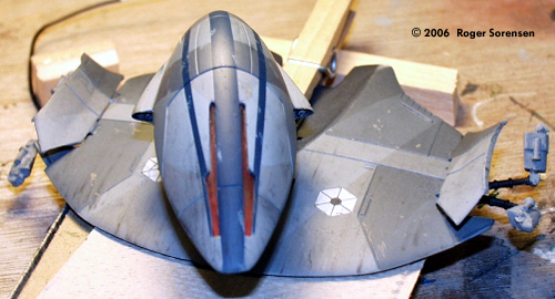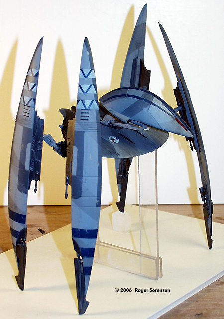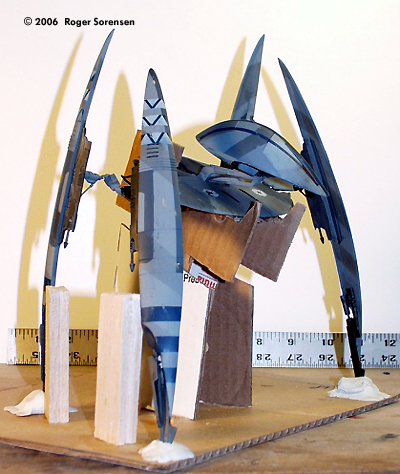 Estes released several model rocket adaptations of spaceships from Star Wars Episode 1. Among them was a Droid Starfighter in attack mode. I picked them up on clearance at a KayBee toy store and put them on my "someday" pile, intending to rework them into models from the movie. This is a rebuild of the fighter into the vulture droid of Episode 3. I began by assembling references. The main reference is the Incredible Cross Sections book from Episode 1. Frame-grabs from Episode 1 and Episode 3 provided additional reference material. Image: Side view, completed modelImage: Front view Image: Steely-eyed gaze |