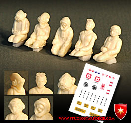 The debut release from Studio StarForge is a series of Rebel Pilots inspired by the popular science fiction movie epics. These resin figures, available in packs of five or ten, are ready for painting. Studio StarForge claims they will fit all 1/72 scale fighters - plastic or resin. There are five individual figures (the ten pack gives you two of each). All are in a conventional (and static) pose with hands in their laps and eyes forward. You get a Mon Calamari, Sullustan, male human in standard flight gear, another in what appears to be cold-weather gear, and a female (not sure the race on this one - could be human or demon). All feature full torsos and upper legs - they are cut off at the knees in order to fit into those ridiculously small cockpits. Each pack also includes a sheet of waterslide decals for helmets as well as some bonus warning placards and stencils for the model. These look to be laser-printed and have a clear overcoat covering the entire sheet. Detail on the figures is excellent, and should really pop with careful painting. My samples had no mold seams to clean up. However, all were marred by small bubbles or 'beads', and one of the Mon Cal pilots looks to be a thin skin of resin over a body of froth. Fortunately, the bubbles are in spots that won't really be seen once placed in a cockpit, and they're also easily filled. Because there are no mold seams to clean up, the frothy guy should not be in an issue either - no sanding means no exposing masses of pinholes, after all. Painting & Placing The detail on these will really reward the careful painter. Placing them in the models will be a bit of a challenge, though. Compared to a set of modern US pilots and ground grew from Hasegawa, the figures look “right” in size and proportions. Using my calipers to measure them from seat of the pants to top of the helmet and then scaling up, I get “real” heights of right around 6'1”; even taking the height a helmet adds, these drivers would be on the tall side. |