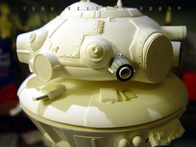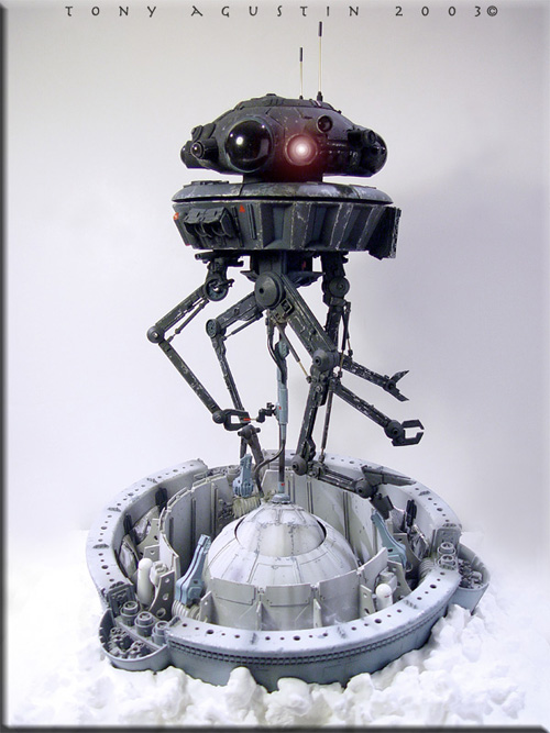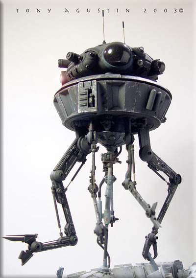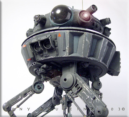 This was SMT's resin kit production of the Probot from the Empire Strikes Back. The 1/6 scale kit went for about $80 and was limited to about 100 kits I believe. Itıs been long since out of production. I had bought this kit over a year ago and started construction almost immediately. I found the kit needed a lot of added improvements to get it to look right, so I added extra detailing to beef up the underside and and added an extra 'eye' to the head/turret area. The neck attachment had to be raised a bit to get the head/turret to clear it's own laser when rotating. |