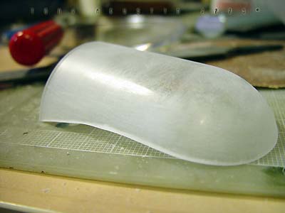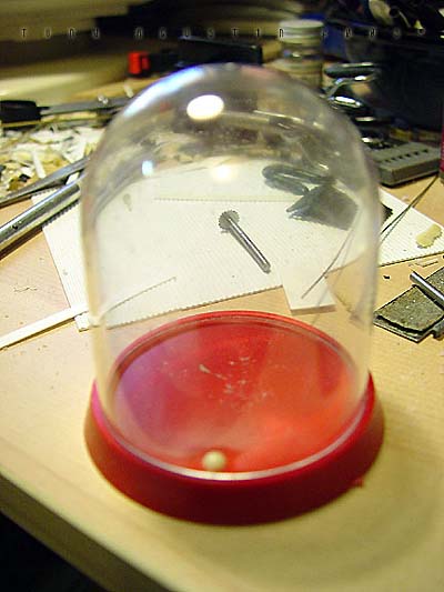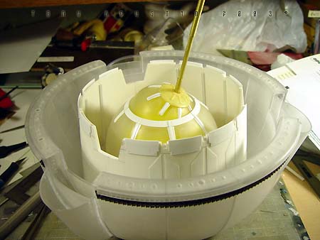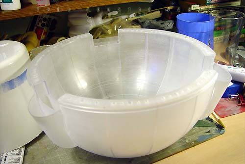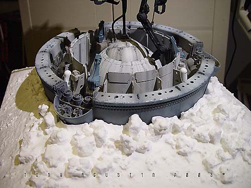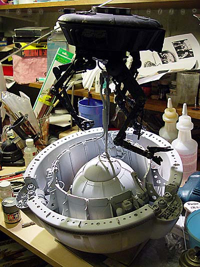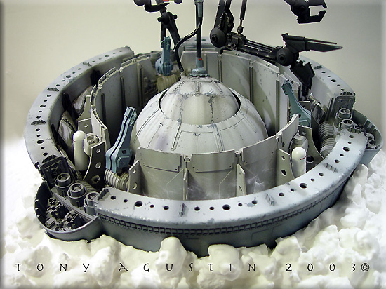 Plastic bathroom kickbuckets and clear craft bowls from a local Bed Bath & Beyond provided the basic parts to the pod. Another trip to 'American Science and Surplus' provided several small items to be used as well. Left over castings from past projects provided the extra detailing. The base was a box-like structure constructed out of hardboard and epoxied together. I built the snow up from styrene insulation foam secured with a hotglue gun. I covered the foam with a thick mixture of lightweight spackling and Future Floorwax to simulate the final snowy texture. This model won a Silver award and also a sponsored award for Best SF Vehicle/Mecha at Wonderfest 2003. Image: I found the kit needed a lot of work to get the detailing up to snuff, so I found some great references in this very large book called The Star Wars Chronicles.Image: The neck base where the head/turret rotates was extended a bit with sheet styrene. Image: Additional optic sensors were added to the head and the laser on the body detailed with bits of styrene Image: The actuators for the manipulator arms were redone. Image: The manipulators arms were detailed out and new hinges were made to accept the actuators. Image: The details of the kit were very simplistic so extra eyecandy greeblies were added to the undercarriage of the main body. Image: Black Krylon primer was sprayed on the kit. I think it was at this point I shelved the project. Image: Seven months later the idea of making a serious diorama re-energized me once again. This time I wanted the Probe Droid rising out of its half buried re-entry vehicle. A trip to Bed Bath and Beyond yielded a plastic children's Kick Bucket and a clear craft bowl. Image: An empty snow globe cylinder from American Science and Surplus. 3 were needed. Image: The snowglobe cylinders were halved and trimmed to fit. Again 3 had to be made. Image: The halves were now attached to the bowl. Image: A halved part of the kickbucket and some detailed spheres were dryfitted to add interest to the inside. Image: Some Alumilite castings were made for more mechanical details. Image: Coming together. Image: I primed the pod and the Probot was test-fitted on its gimbaled support. Image: A wedge shape base was constructed out of hardboard. The pod was secured with screws from the bottom. Image: Snow had to be replicated but I didnıt know how to go about doing it. I didnıt want to use plaster or baking soda because it didnıt look ight to me and wasnıt permanent enough, so I made up the following: To start off, styrene insulation foam was cut into little wedges and hot glued in place. This became the understructure for the snow. Image: Lightweight spackling was spread evenly onto the surface of the foam with an artist's trowel. Image: The result. But wait....... Image: ......a concoction of my own invention: Lightweight spackling and Future floorwax. Crumbly chunks of insulation foam was mixed in. Image: Itıs still wet, but the effect of displaced snow is taking shape. Image: The final result. Iım not sure how permanent this technique is but so far itıs still holding up. |