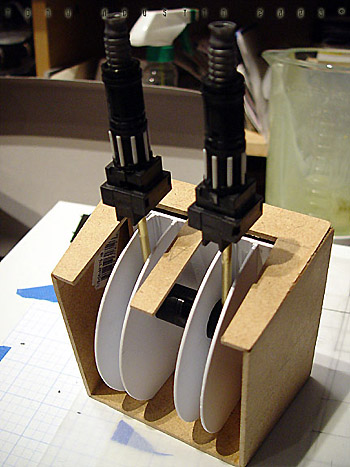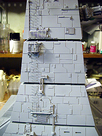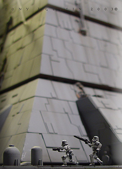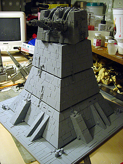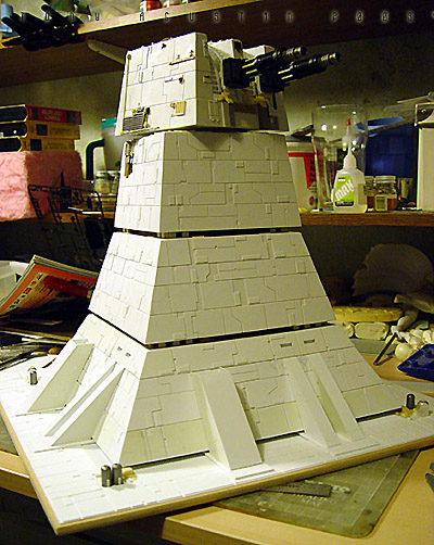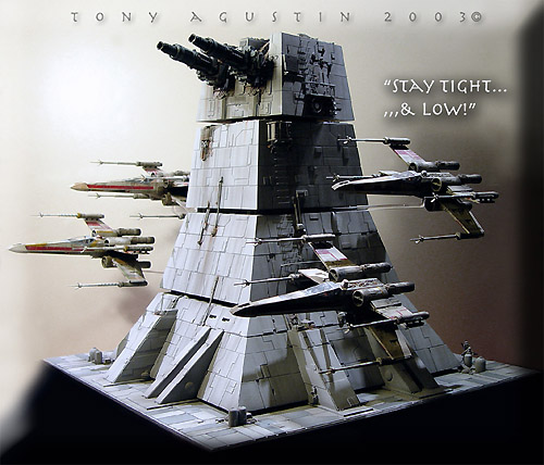 This diorama came about due to the fact I had bought four Fine molds X-wings but I didn't want to just stick them on a stand like I did to my other four ERTL X-Wings. This was going to be my first serious scratch build and I wanted it to look good. I prepared myself by digging into old Star Wars magazines and doing internet searches looking for Laser Tower references. I knew I couldn't duplicate the details from the actual filming miniature, so what I did was make it up as I went. I tried to capture the essence of the original. Besides I think it's more fun that way to invent your own details. |