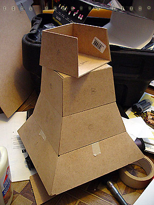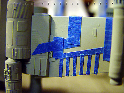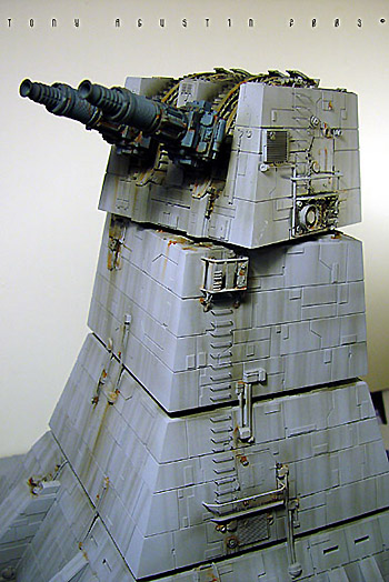 The understructure of the tower is 1/8" hardboard sheet cut to size and glued with a 2 part 15 minute curing epoxy. Then the entire structure was sheathed in styrene and the plating was meticulously cut one by one and cemented in place with liquid cement. I raided a local 'American Science and Surplus' store to search for anything that might make good candidates for the two turbo laser cannons. I raided my parts box and my 'never gonna be built in my lifetime' armor kits to locate appropriate details. I had to make multiples of some small parts so I used Alumilite's casting kit to make molds and cast the extra parts. Once all the details of the Laser Tower were put together, I sprayed the entire thing with Floquil Gray Primer. It was the perfect color for it. I weathered the tower in acrylics enamels using an airbrush and stippling with a paintbrush. The X-wings I built, painted and weathered in a little assembly line so as to finish them quicker. I ended up masking the bold red stripes and painting them on instead of using the decals. I didn't want the fuselage and wing panel lines to be obliterated by the thickness of the decals. Acrylic rod was heated and bent to shape to be the support arms for the X-wings. Holes were drilled into the both sides of the tower to accept the acrylic rods. For fun I wanted a couple of Storm Troopers to chase after the rebel fighters on foot brandishing their rifles, so I repainted two MicroMachine Stormtroopers and placed them in an inconspicuous area near the tower. This model got a Gold Award at Wonderfest 2003. Image: A simple profile of the tower was drawn up actual size to the model.Image: The drawing was transferred to a large sheet of hardboard. The pieces were cut out with a scroll saw. Image: The pieces were epoxied together to form the inner structure of the tower. Image: Sheet styrene was epoxied and superglued to the hardboard. Image: I made another drawing to figure out how to make the turret itself. Image: The turret mechanism was constructed from brass tube and thick styrene sheet. The cannons were made from pens and some electronic gizmos. Image: Here we see the turret sheathed and partially detailed with Evergreen structural shapes. Image: Plating started from the top on down. Horizontal strips were cut into individual pieces and secured with liquid cement. Image: Plating completed. A few kit parts were added around the turret. Image: Kit parts from tanks and a medical humvee were added next. Image: A base is constructed for the towerusing the same materials as the rest of the diorama. Image: Here we see the turret detailing finished. Staples were used for the ladder like hand grips. Small multiple parts were made from Alumilite (resin). Image: The Tower was primed and ready for weathering....or so I thought. Image: I found an additional reference photo that showed a more detailed picture of the side basket. I scraped off the primer on the appropriate side and added the additional detail. Image: I love how primer blends everything so nicely. Image: I weathered the tower with an airbrush using acrylic enamels. Additional weathering was done with a small brush. Image: Time to do the Finemolds X-Wings. Image: The X-Wings were primed, then a basecoat of Camo Gray with a touch of white was airbrushed on. Image: I decided to mask the bolder red markings instead of using the decals. I didn’t want the panel lines to be obliterated. Image: The red markings were airbrushed on. Image: All four of these X-Wings have their own distinct individual type of weathering and paneling. Image: The X-Wings were weathered and the remaining decals applied. A final coat of Gunze Sangyo Clear Flat was airbrushed on. |