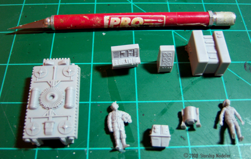 The two-piece (three, if you count a strip of styrene for the grab rail) repulsorlift tractor is detailed underneath but smooth on the topside - the details on the bottom are probably conjectural, but they look good. Detail on the various pieces is nicely done and adequate for the scale and small size of the pieces. Casting throughout is very good. I only found a few small voids, all on the back side of pieces where they would be glued to the deck. Flash was almost non-existent. About the only drawback I see is that the deck lights - which look like tiny droids or maybe "scutters" - plus the latter and astromech domes are all cast onto a not-insubstantial wafer of resin maybe .015" thick. I'm sure this was done for economy's sake when molding, but it does mean you will have to carefully sand the 'wafer' away from the parts before they may be used. That's tedious, but not difficult. No instructions are provided with the kit. The Trilance website, however, has some explanatory text and several photos that are helpfull. Conclusions If you want to do a hangar scene, or even just include some maintenance/service equipment to give your models a sense of scale, this is a very good start. There's enough parts in the kit you could spread them out between several models. The high quality of the parts and the castings should make them easy to use - pretty much just paint and place. Recommended. Many thanks to Triliance for providing the review sample. Manufacturers and retailers, interested in getting your wares reviewed and publicized on a site averaging 3500+ readers a day? Contact us! |