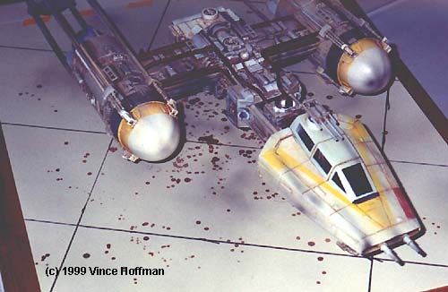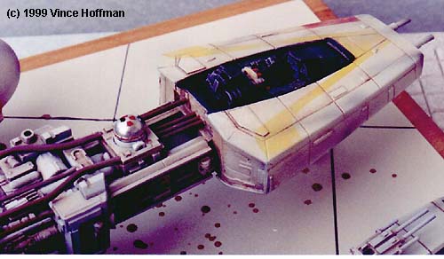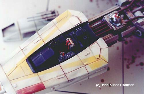 TheY-Wing first sold by SMT (no longer; the molds belong to an outfit called Idea Factory) is a very accurate and nicely detailed replica of the original studio model. Basic info about what you get and how it looks was covered in the in-box preview report, so I won't go into it here. Parts cleanup took about 5 hours with careful attention paid to the rear thrust vectrals. Putty was applied sparingly to air bubbles and areas where the resin did not fill the mold, and other details that did not form completely and could not be salvaged were shaved off and replaced with stock plastic.Some parts did not mold well and were replaced by stock plastic. The main nose guns were re-built from telescoping plastic tube, as were the ion cannon barrels. The cockpit was dressed up by shaving off the side console control panels and re-casting new ones with much crisper detail. The seat was detailed with a flight harness and buckles. Exposed pipes and conduit on the exterior were replicated by bending different diameters of brass wire. The parts fit is very good with the canopy fitting especially tight. Some sanding of the bottom edge of the canopy will allow it to fit better without forcing and possibly breaking the fragile part. |